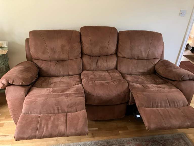 3 seater sofa with 2 recliner seats. Comes apart for easy transportation. Dark tan faux suede.