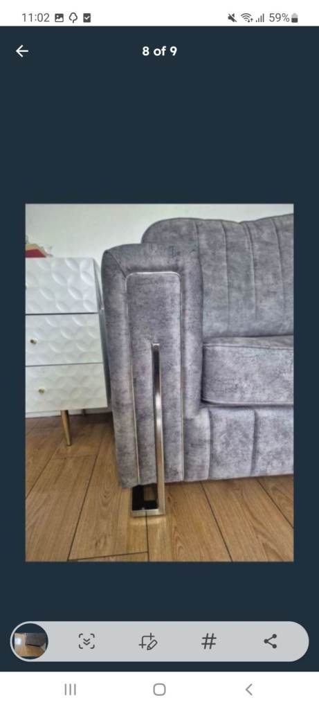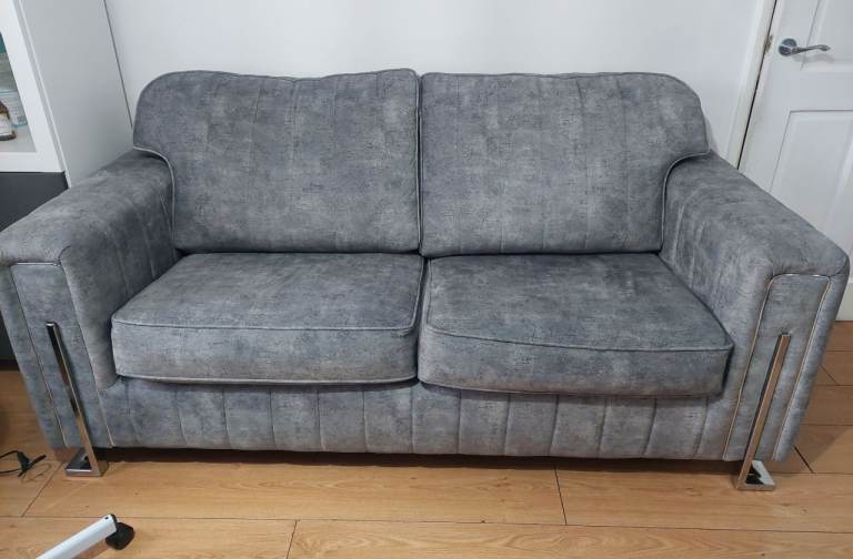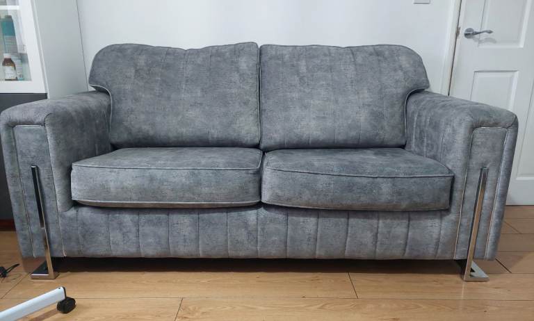 3 seaters x2 grey marble affect suede sofas, silver crome legs only got them Last week for new house But Are Big. Pet and smoke free . Payed £1700 For Them. No sign of wear and tear. Like Brand New. £800 For The Set Off 2 They Are Both 3 Seaters.