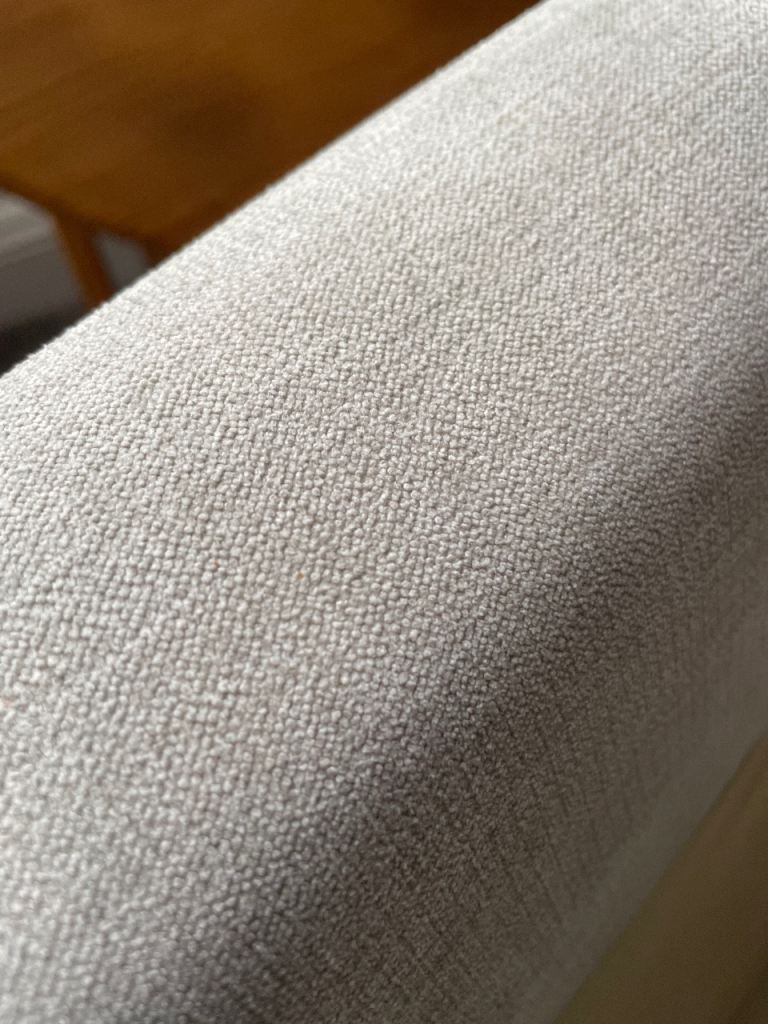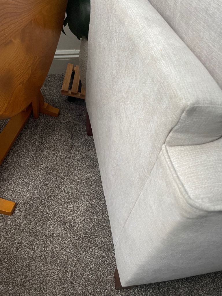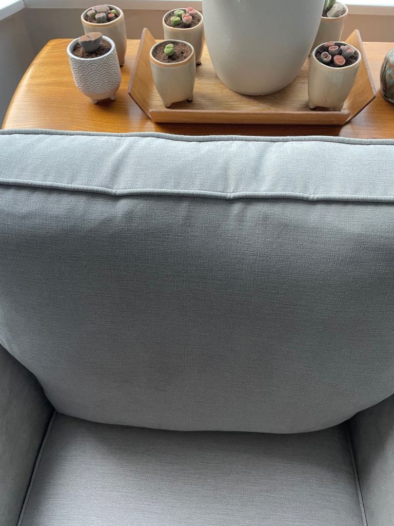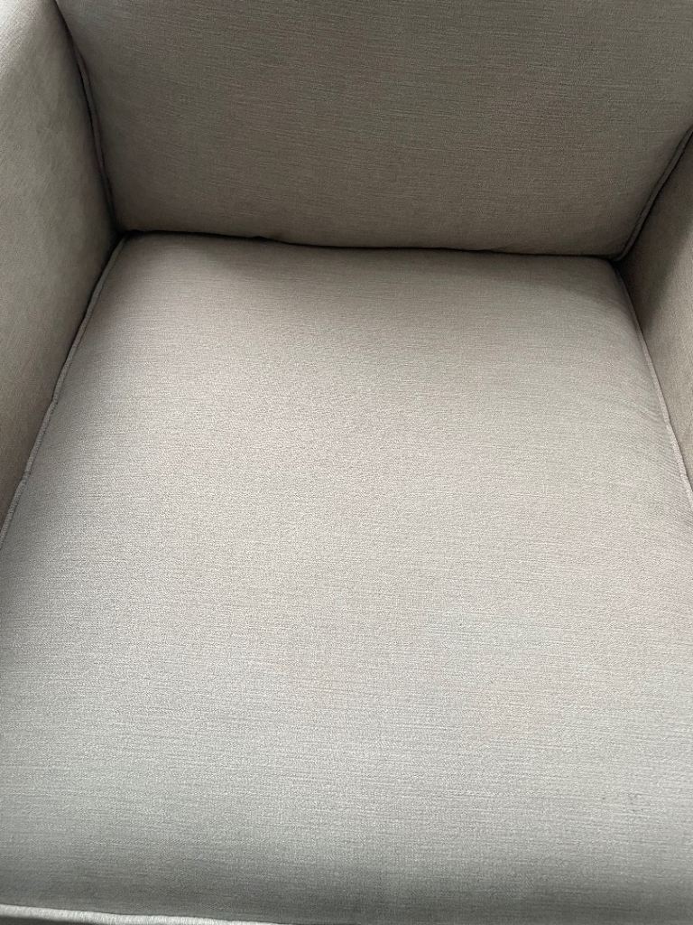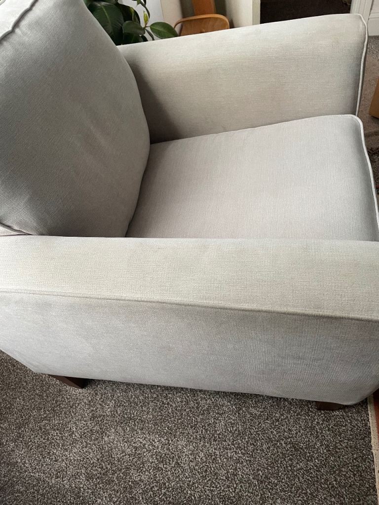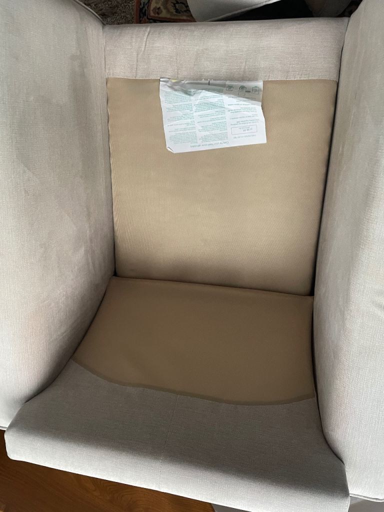 Extremely comfy chair, selling because moved to a smaller house. It has a few very light marks, easy to remove with a sponge and some foam detergent. Fire retardant labels on. It needs to go soon hence the low price.