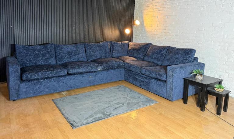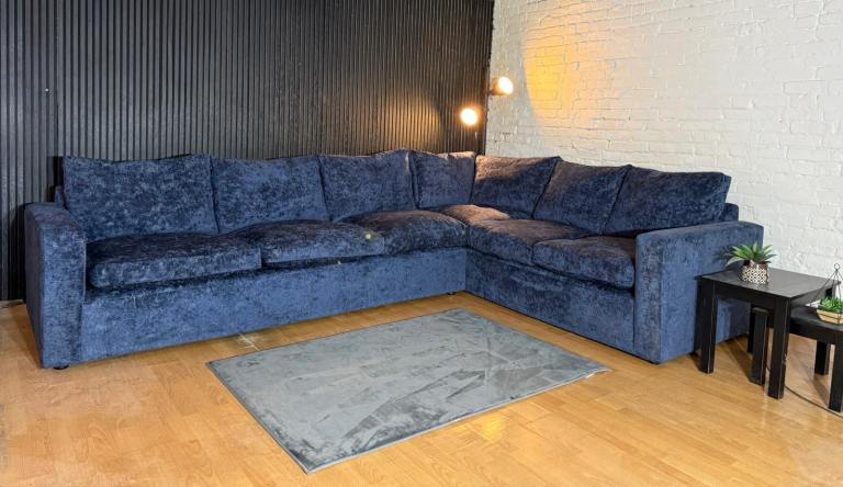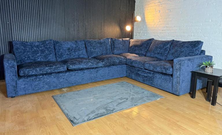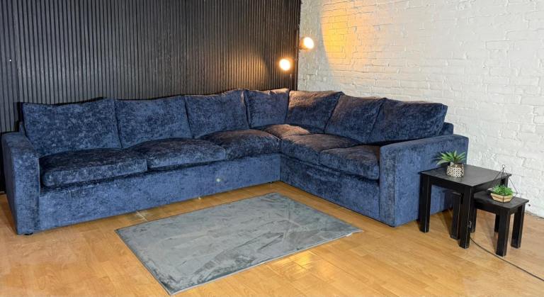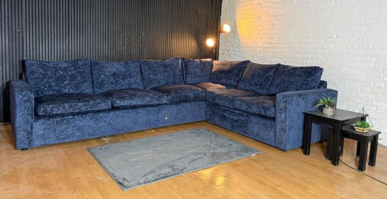 Stunning Barker & Stonehouse Artenis large corner sofa upholstered in a premium blue chenille fabric, offering a luxury look and feel with exceptional comfort.