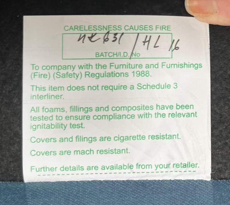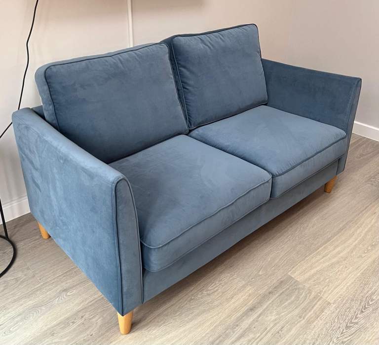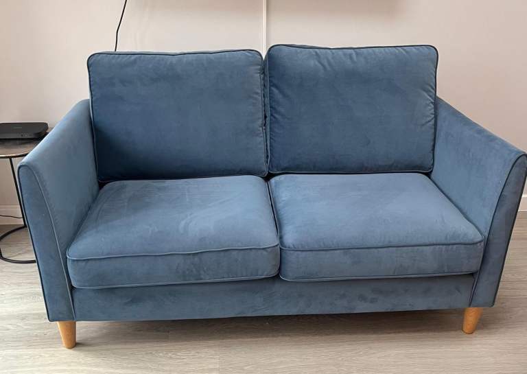 Ellie 2 seater sofa in blue with light oak legs, purchased from Hunters of Derby