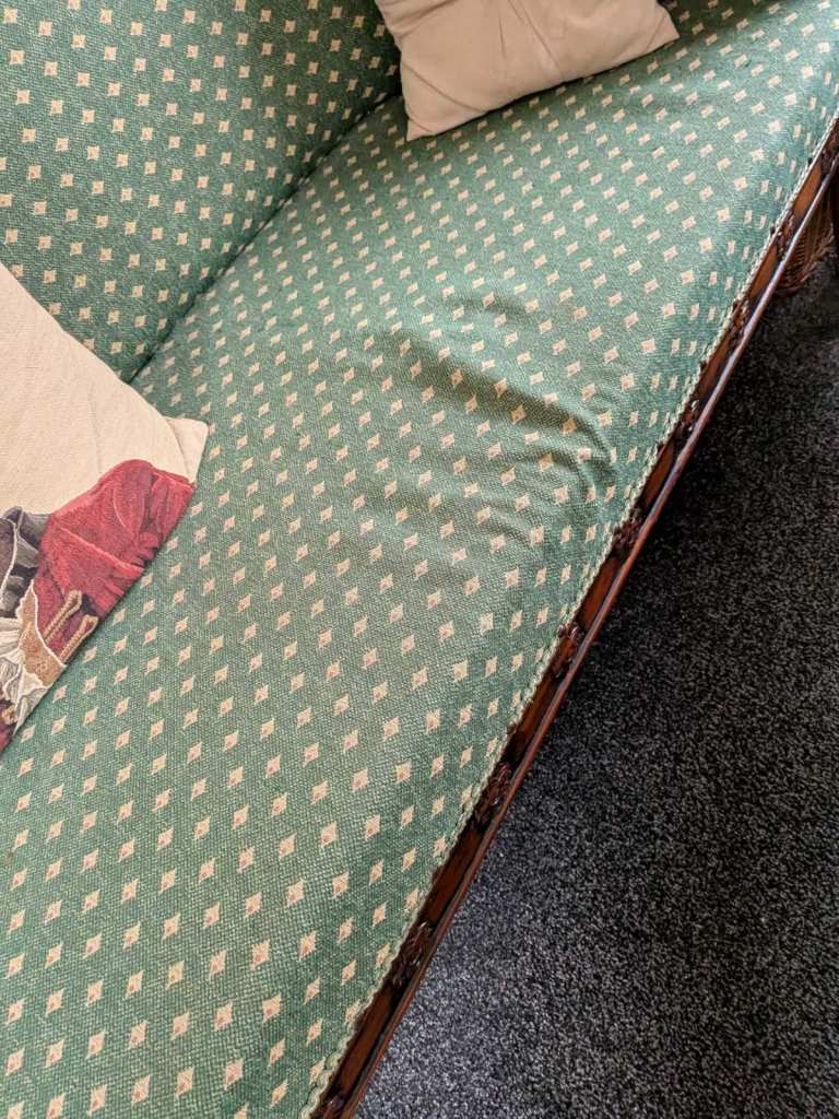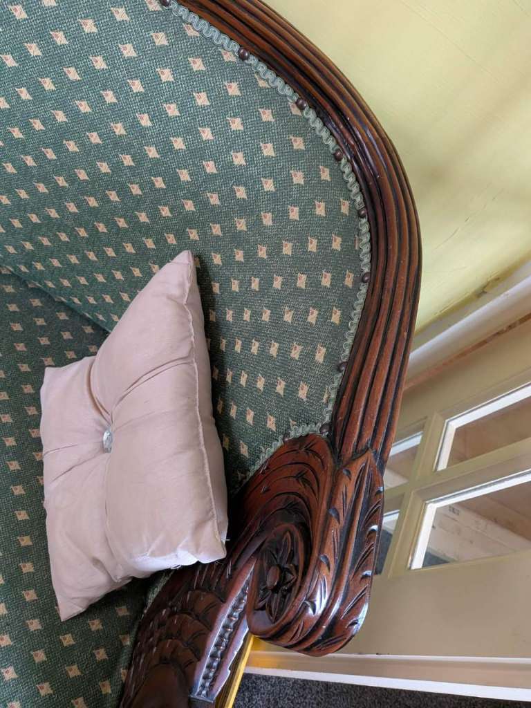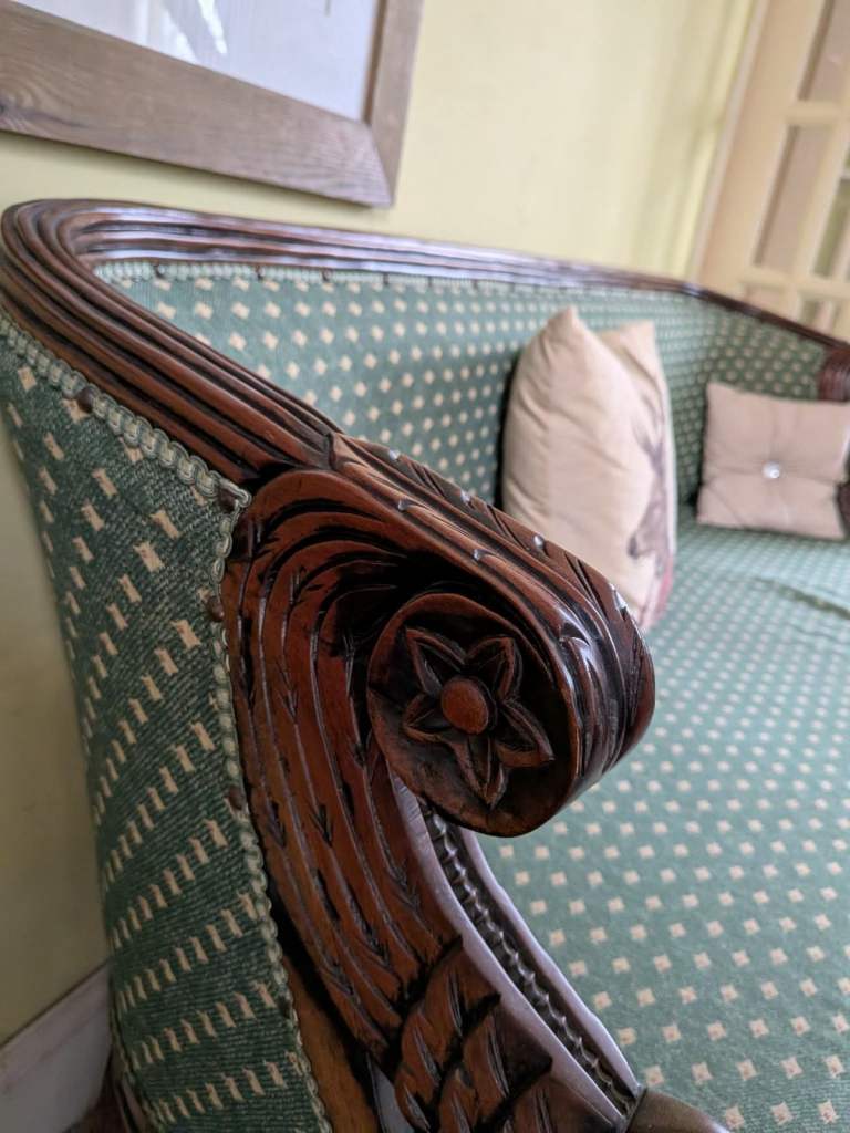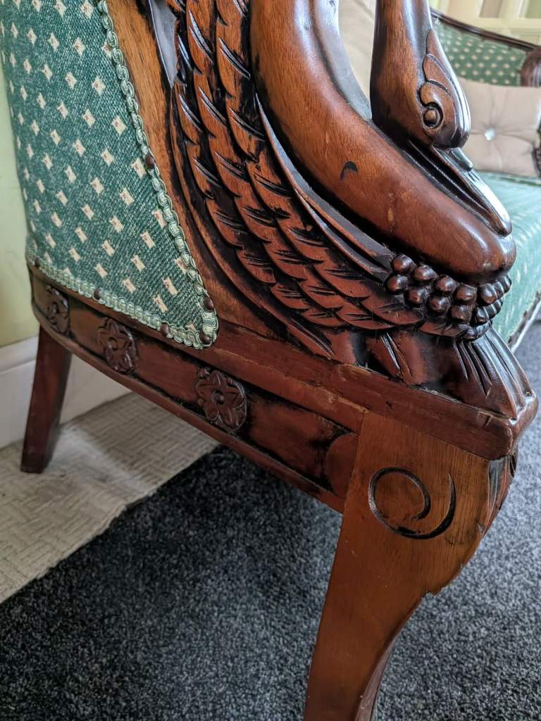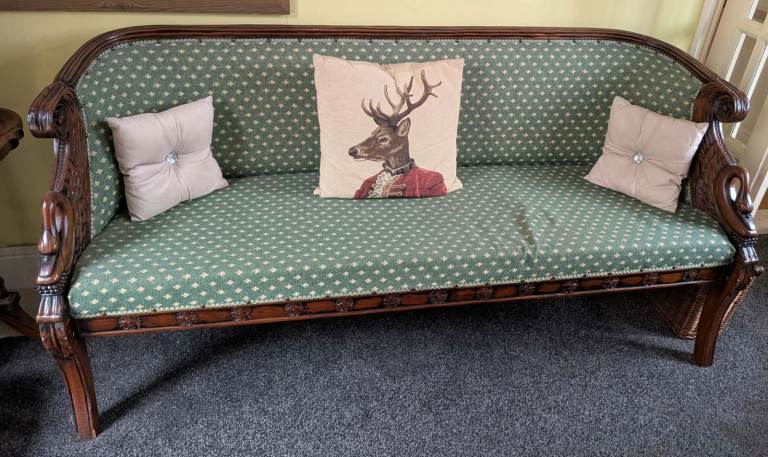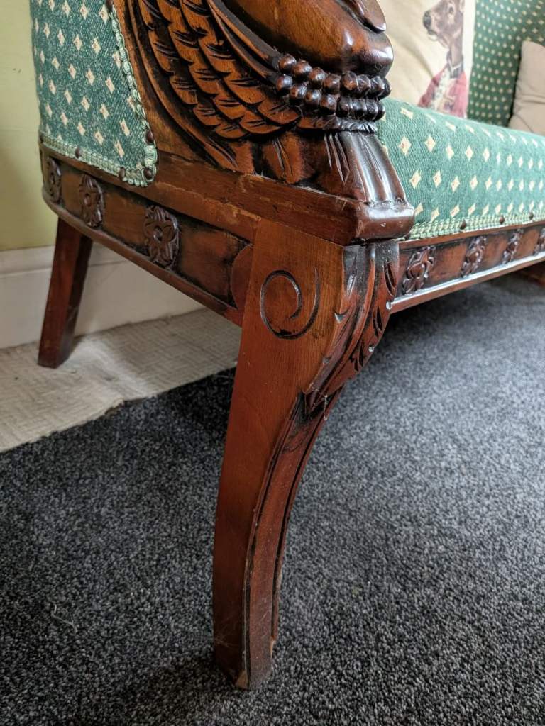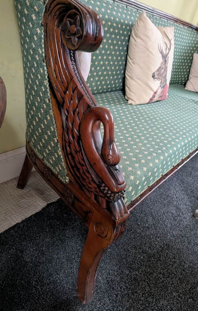 Beautiful Solid Wood Swan Chaise Lounge This is an lovely elegant chaise with intricately carved swan details for arms. The trims are also decoratively carved making this a beautiful piece for any room. The fabric is in lovely condition with all stud fastenings in place.. Measures 176 x 85h x 60d cm. £550. Collection LN8