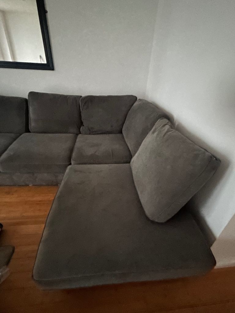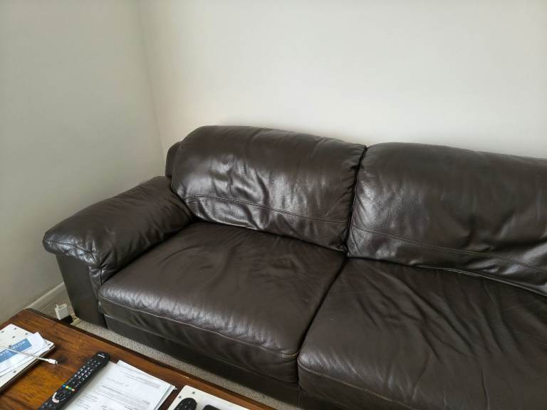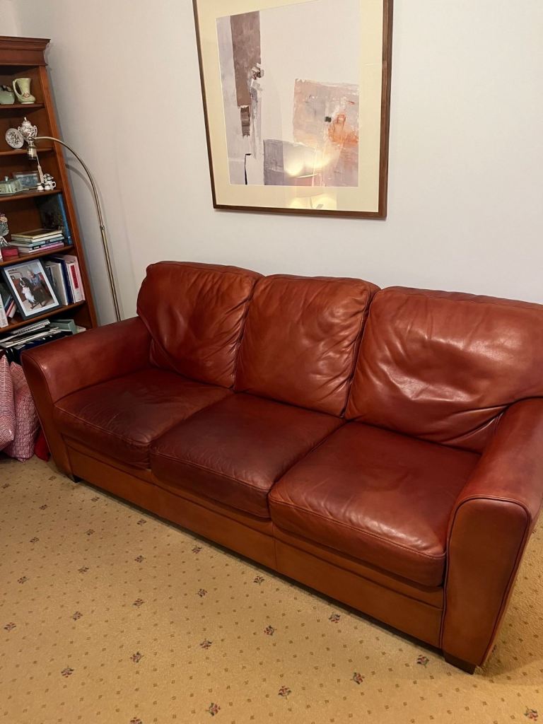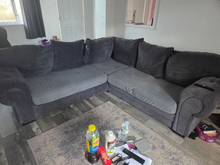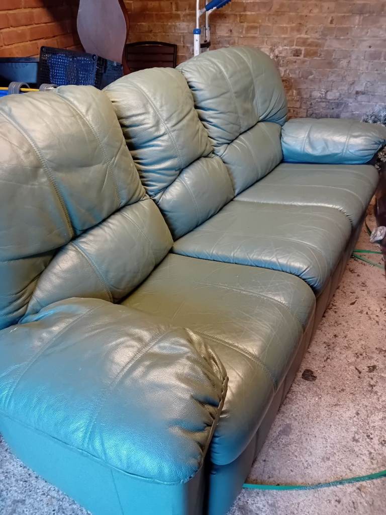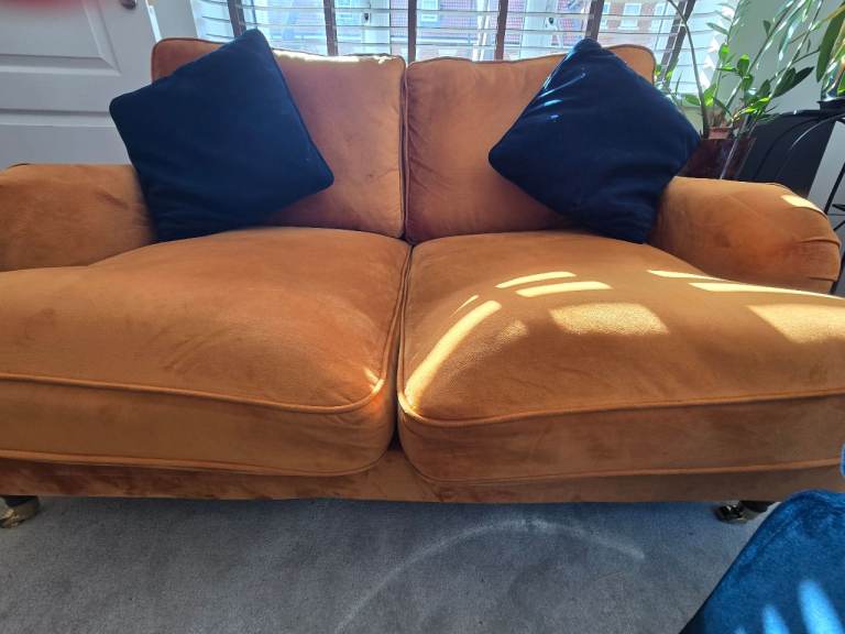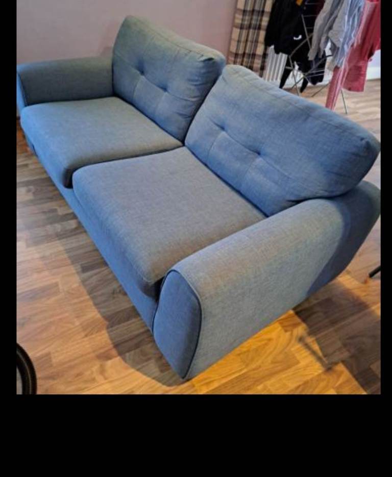 Lovely blue fabric settee, comfy and well-kept. To big for new house