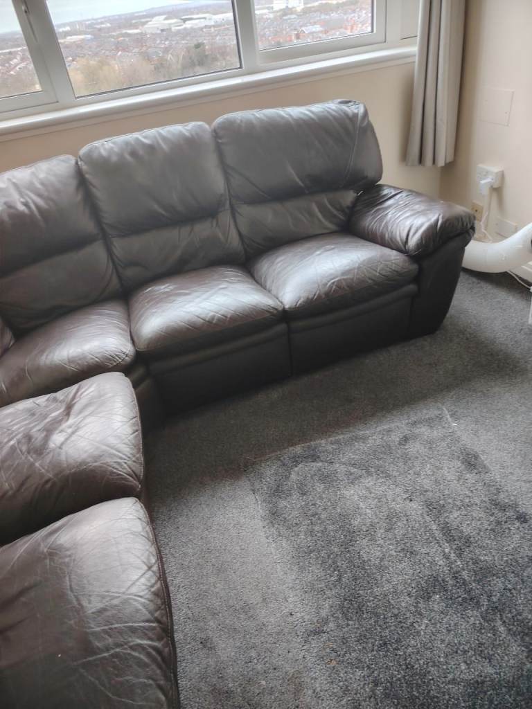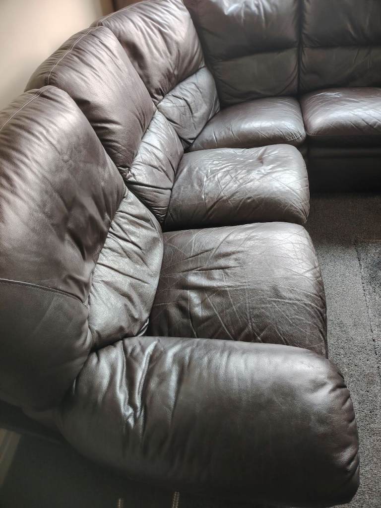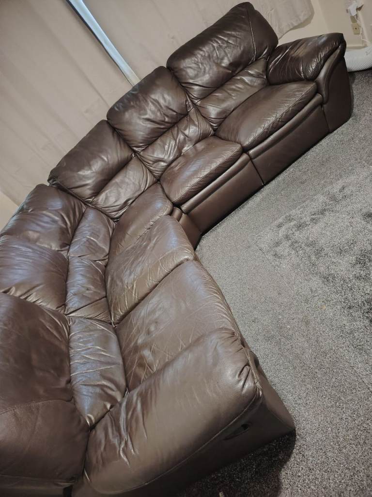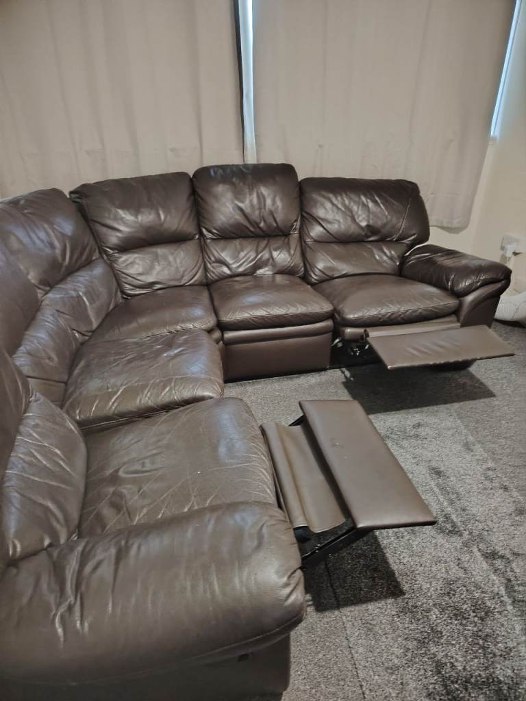 Secondhand brown leather corner sofa well used but still OK 2 end seats recline as shown in photos, buyer to collect can't deliver,