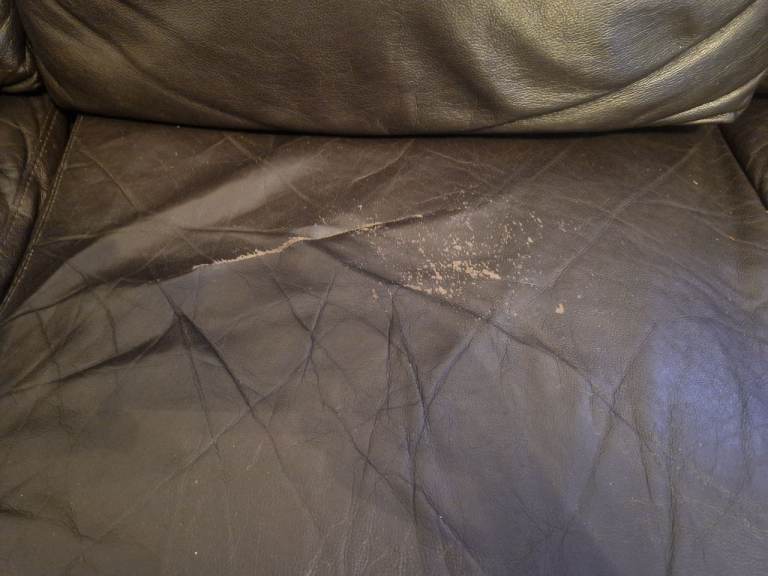 Brown leather Sofa. comes in 2 parts for transport. Small tear and marks on middle seat see last pic. Easily covered with a throw or bum on seat.