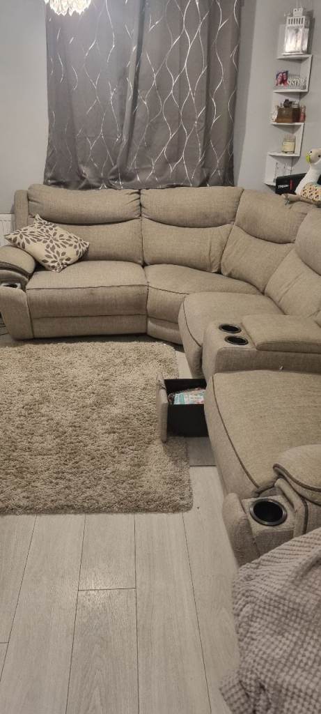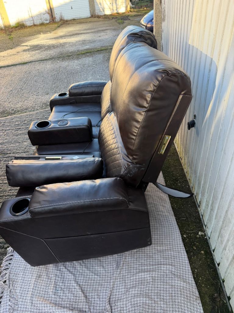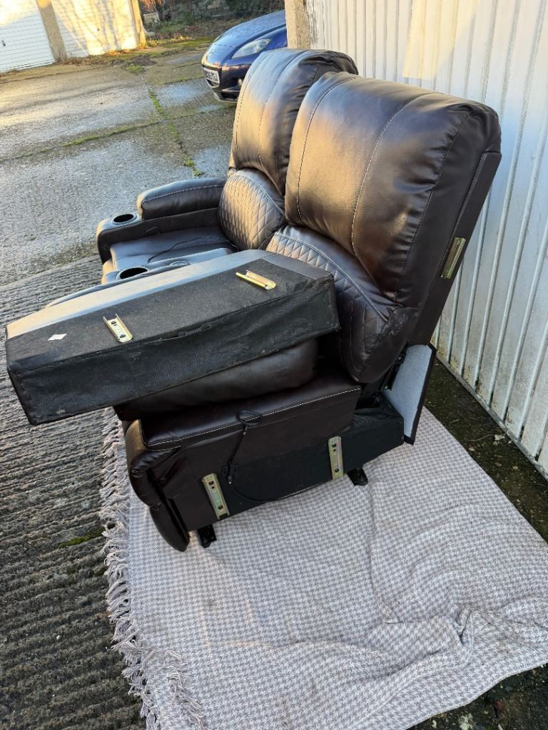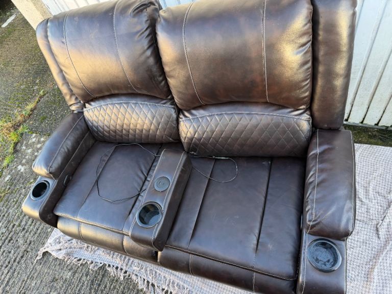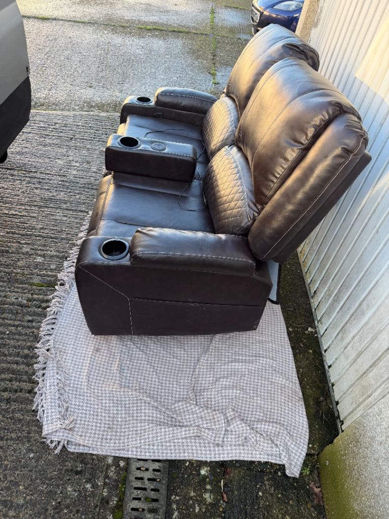 Brown leather two seater recliner sofa with cup holders. Fully detachable as everything just slots in.