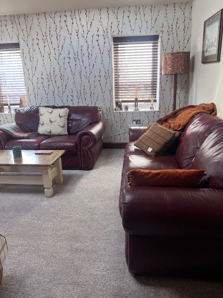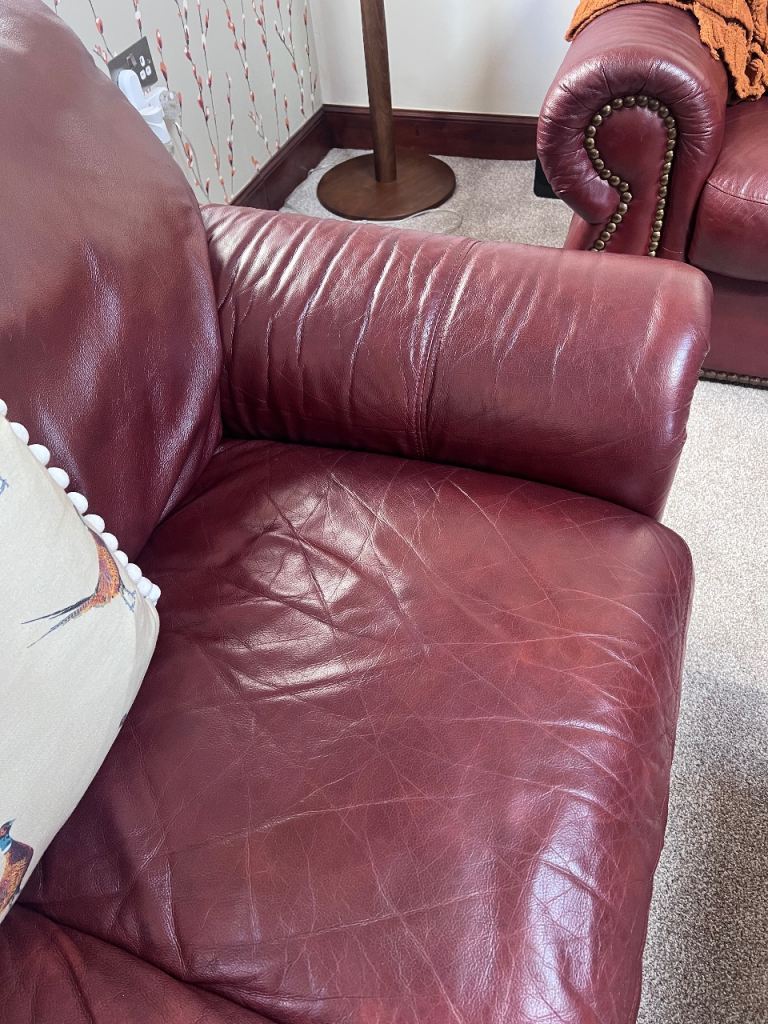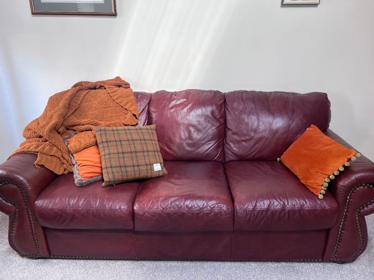 Sofas for sale with duller gold studs. One is a 3 seater and the other a 2 seater. Both in very good condition. Only selling due to different colour scheme.