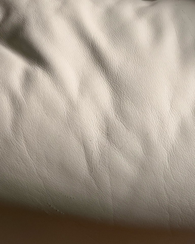 Material is Leather in off white, all mechanisms are working and in good condition, a minor surface scratch on leather as pictured on one side but barely visible.