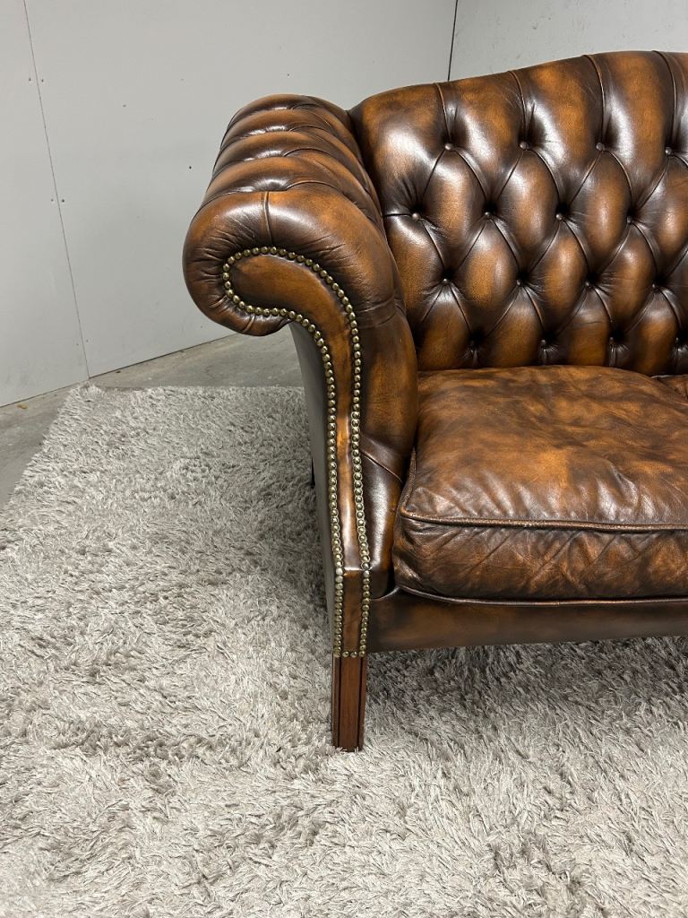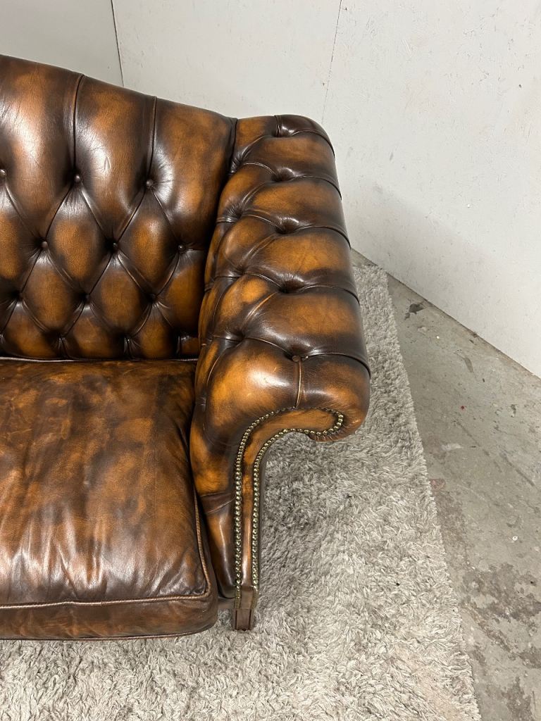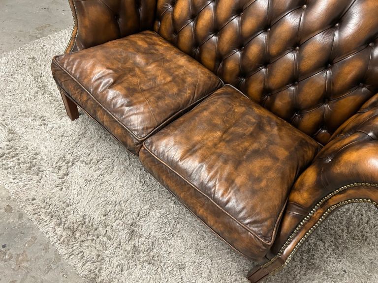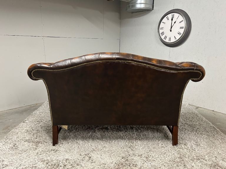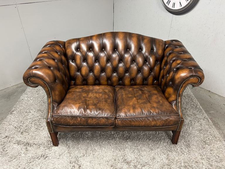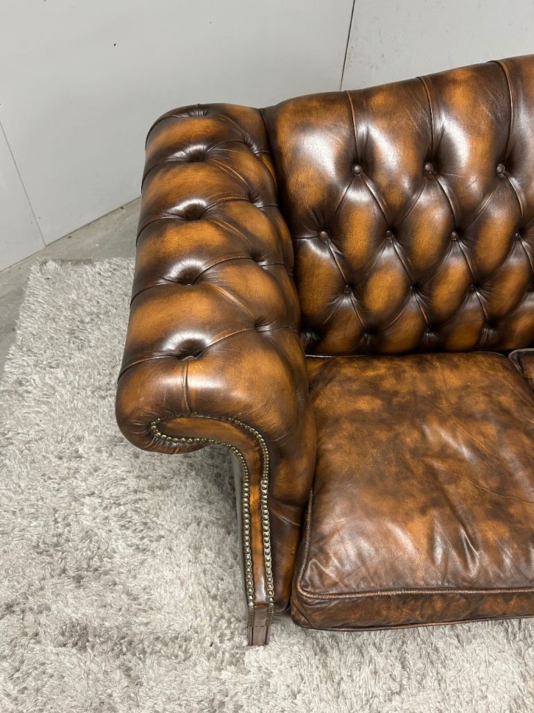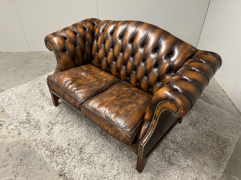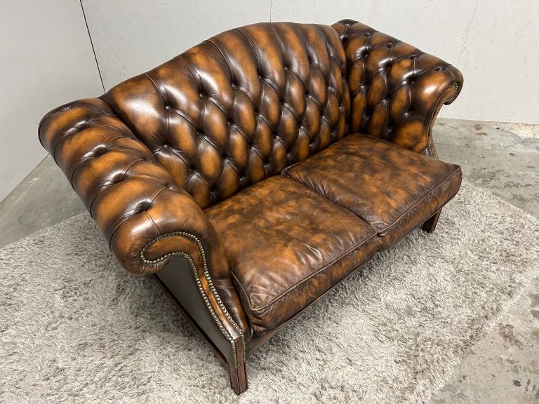 On sale today is this stunning Chesterfield 2 seater sofa finished in a beautiful antique whisky tan leather. We have worked with pre-loved chesterfield furniture for a number of years now and can safely say the thickness of the full grain hide is second to none. The seat cushions are feather filled making this piece amazing comfortable to sit in and very luxurious. The piece is also very heavy demonstrating it has been made with a solid wood frame and thick hide.