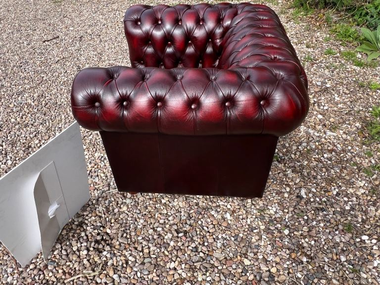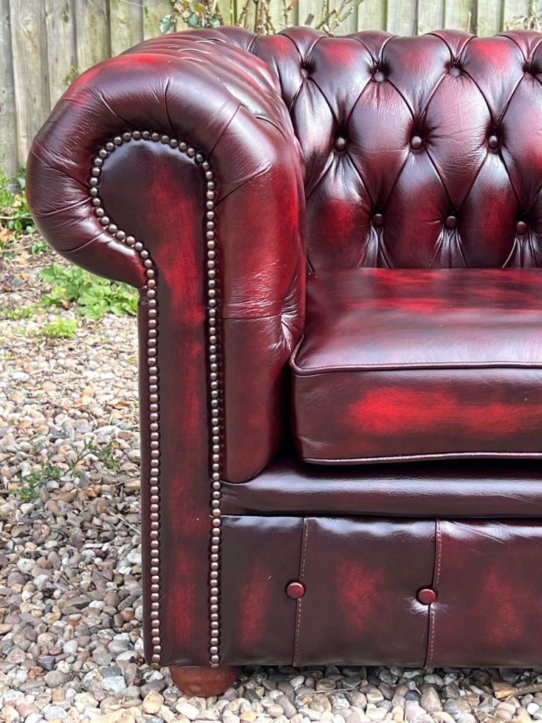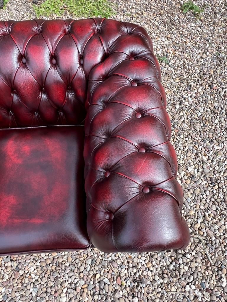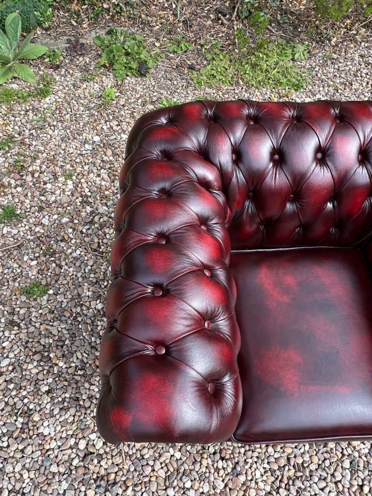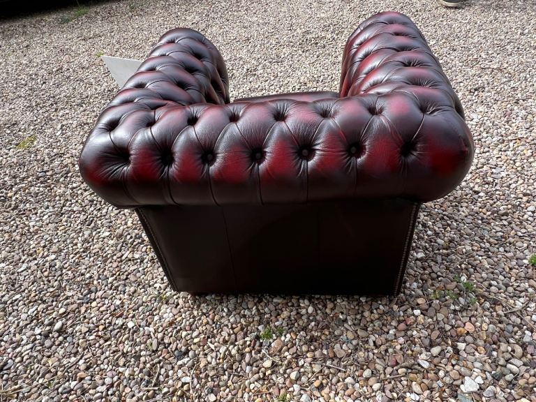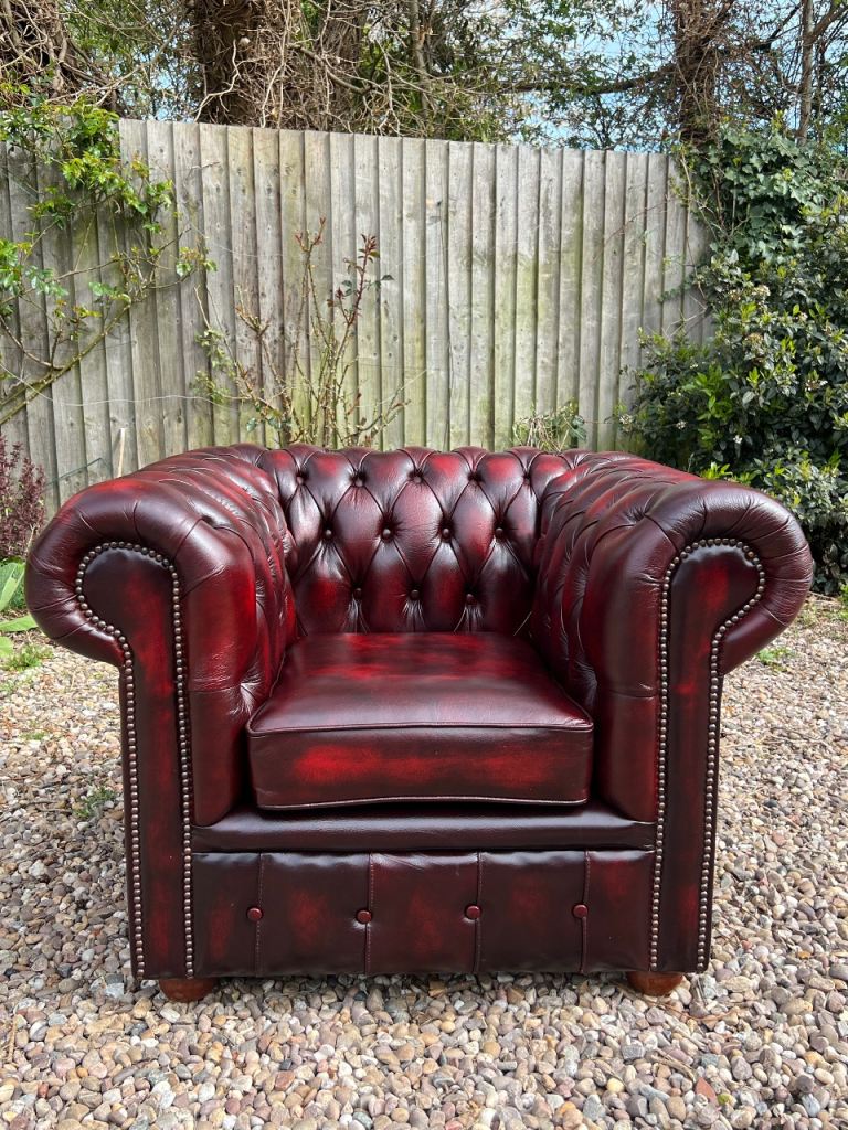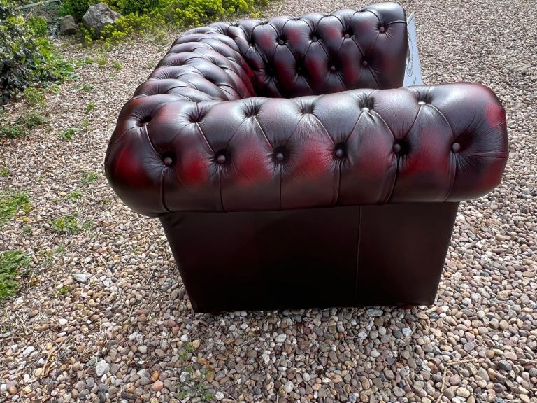 I have for sale a Beautiful Chesterfield Club Chair. This Stunning chair has a solid wooden frame and is covered in a wonderful Deep Oxblood Red Leather. It has then been finished with Antique brass studs detailing and sits on wooden bun feet. It is in Excellent condition with no rips or tears or buttons missing. It has barely been sat on.