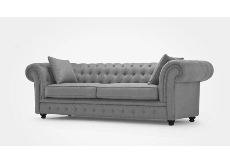 Stylish and comfortable 4 seater Chesterfield sofa in a modern grey fabric. Deep seats and classic rolled arms make it perfect for relaxing while still looking elegant in any living room.