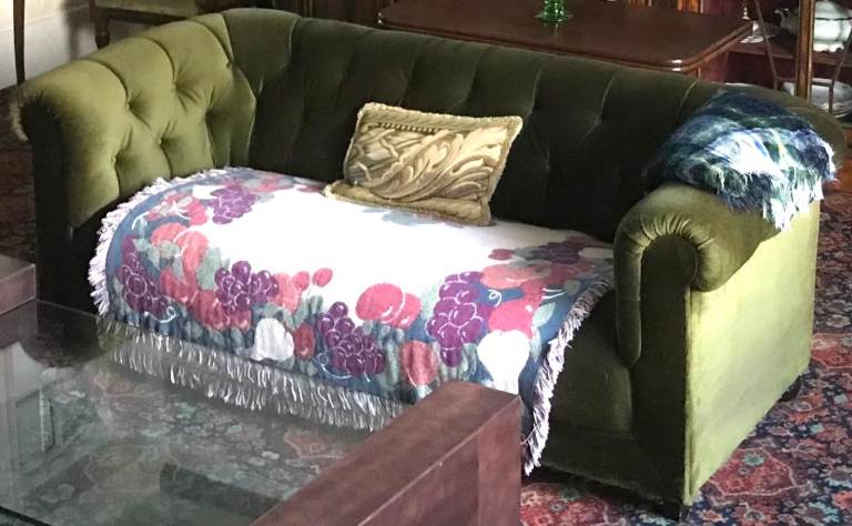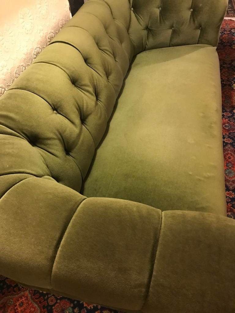 Three-seater Chesterfield sofa in green velvet. Approximately h69 w191 d88cm. Cash on collection from Braintree.
