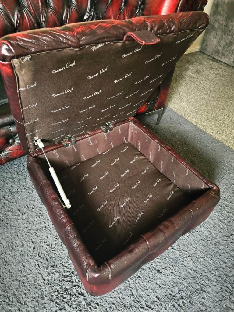 + Thomas Lloyd red leather Chesterfield footstall with storage space ,540mm square 330mm high.