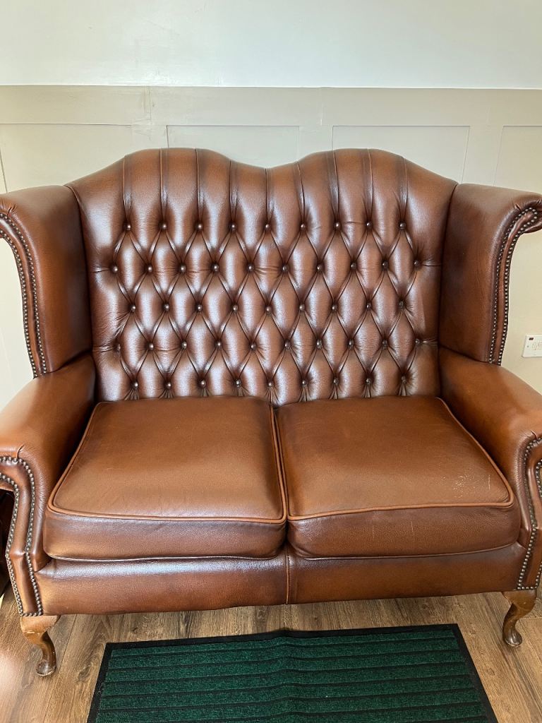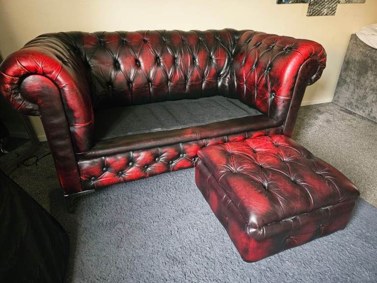 Classic dark red/burgundy leather Chesterfield 2-seater sofa with chrome legs.