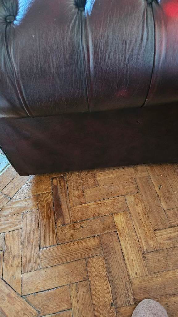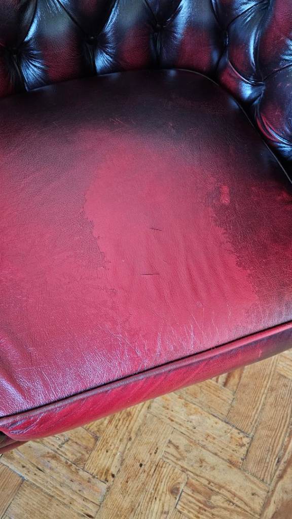 No rips or tears in the leather but it is aged please see photos. The arms of the sofa bed and club chair have a few marks but they are not really noticable. See photos.