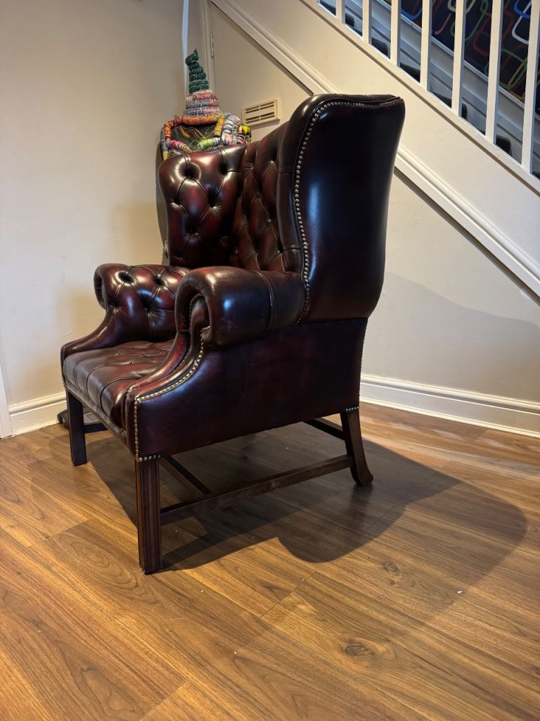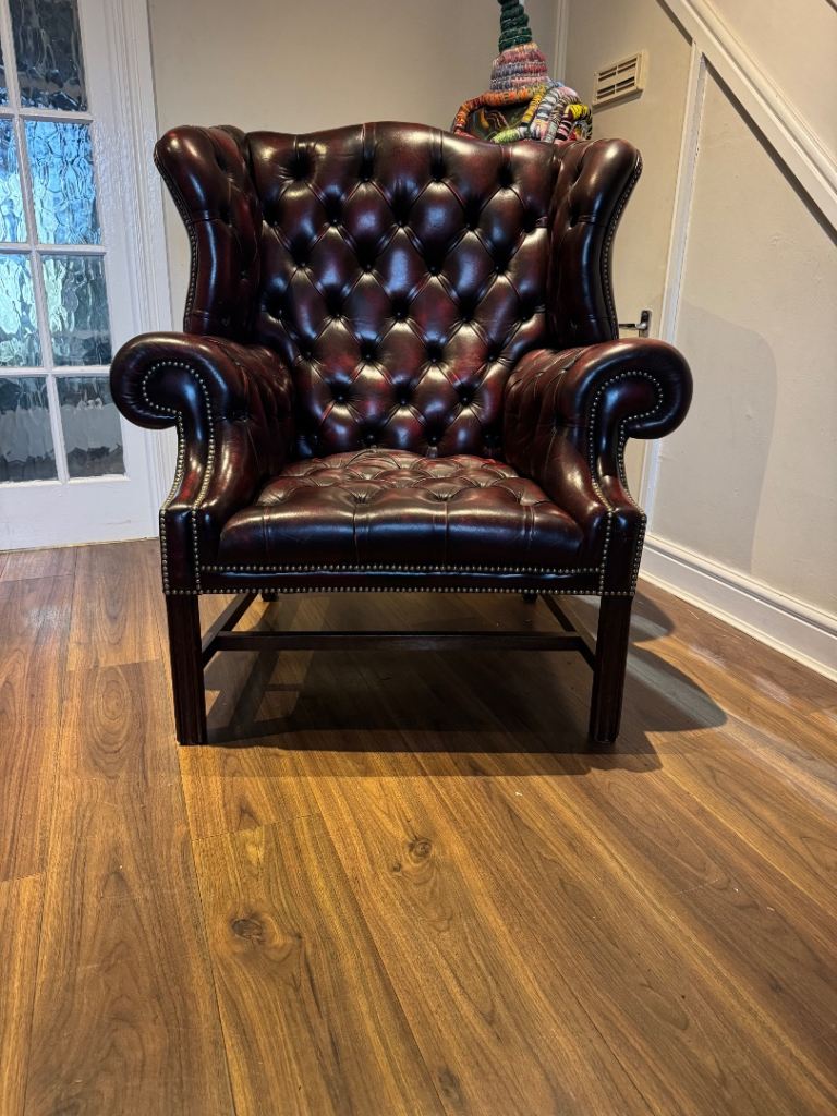 CHESTERFIELD TUFTED ARMCHAIRS IN OXBLOOD +SADDLE FOOTSTOOL 🚚 EXCELLENT CONDITION