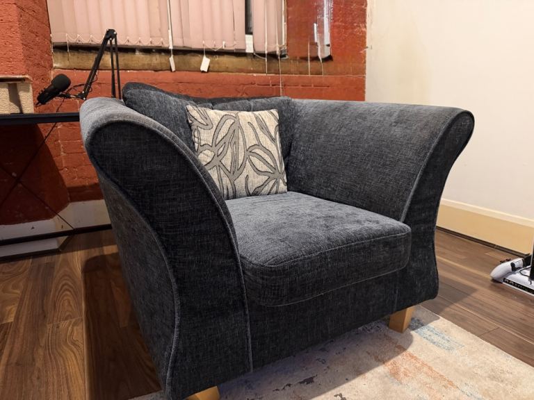 Comfortable grey fabric sofa in good condition, with a soft upholstered seat, curved armrests, and a sturdy frame that makes it great for relaxing, reading, or extra seating in the living room or bedroom. It’s been well looked after, clean, and has no rips or major marks, and it comes with the decorative cushion shown in the photos. Neutral grey colour so it fits easily into most homes and doesn’t clash with other furniture. Collection only, available for pickup in Bolton