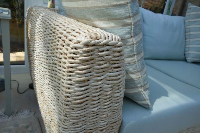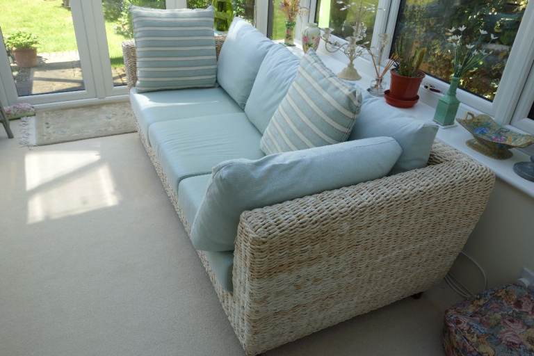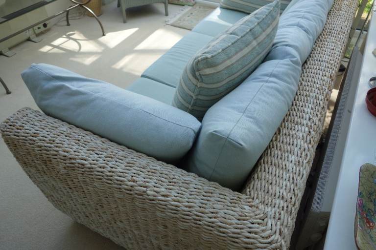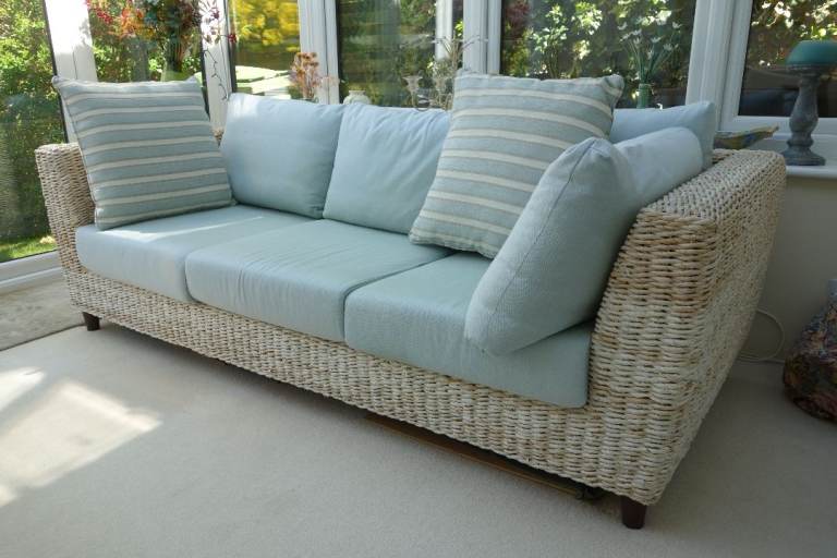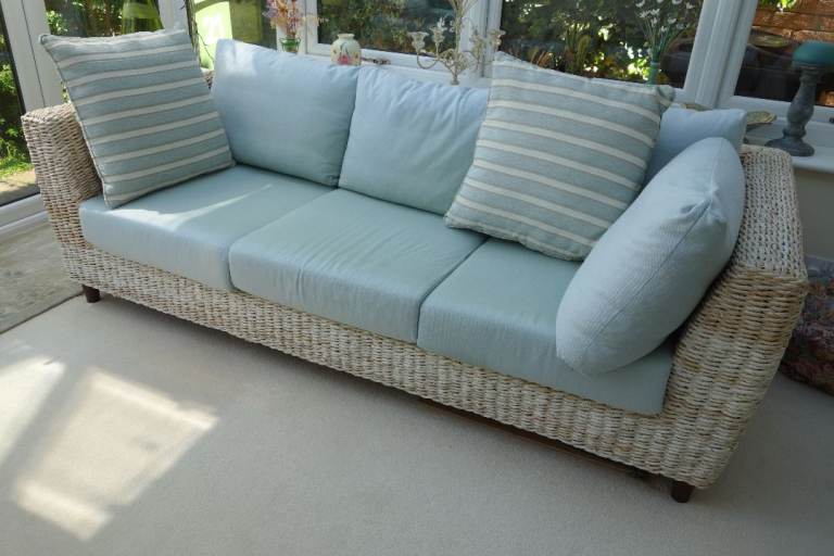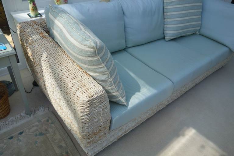 Large 3 seater conservatory sofa originally purchased from Holloways Interiors, Worcestershire. To include 2 large scatter cushions as shown in photos. In very good condition though some colour fading due to effect of sunlight. Must be seen to appreciate high quality and condition. It is made from twisted rattan with twisted banana leaf. The base cushions are foam and the back cushions are feather. Dimensions: w 217cm, d 98cm, h 85cm.