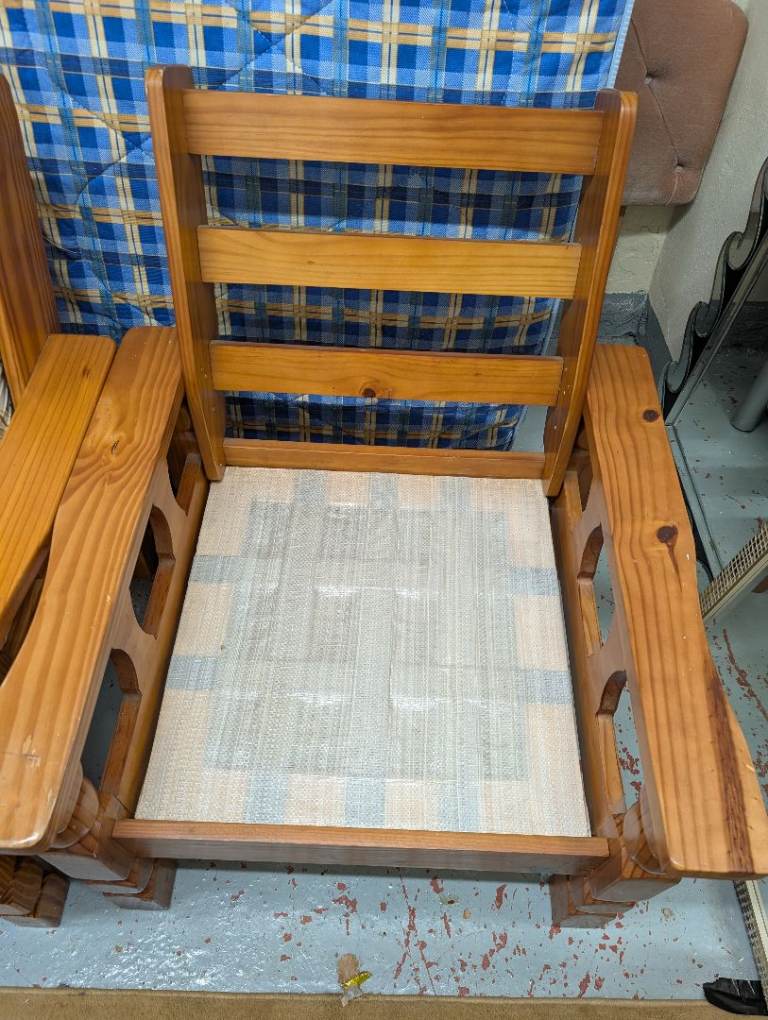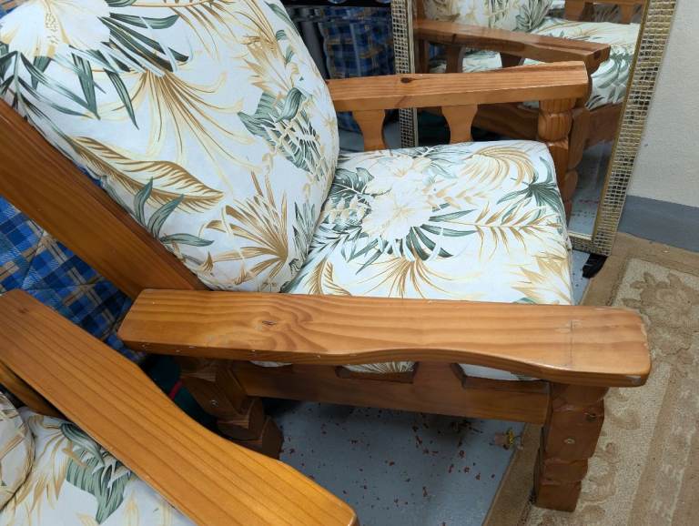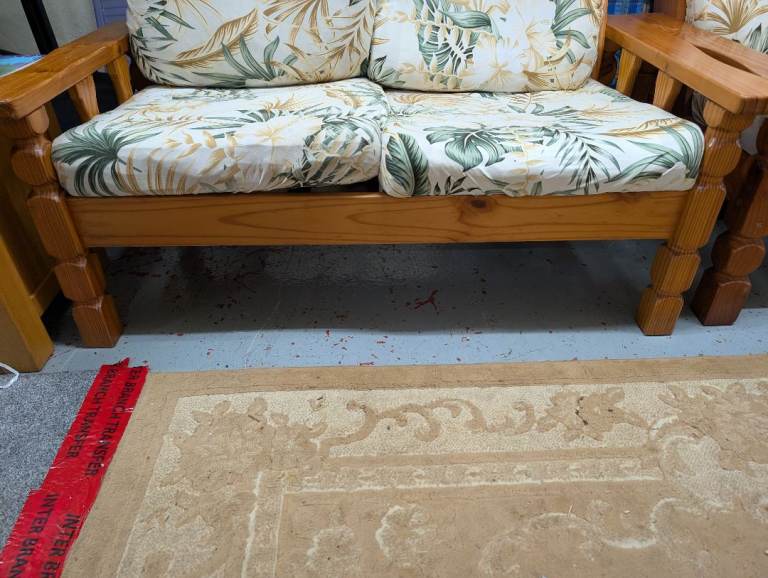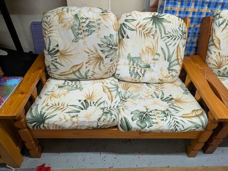 Hi selling lovely wooden conservatory suite item all nice clean odd marks scratch on item the covers on cushions do come off and can be washed