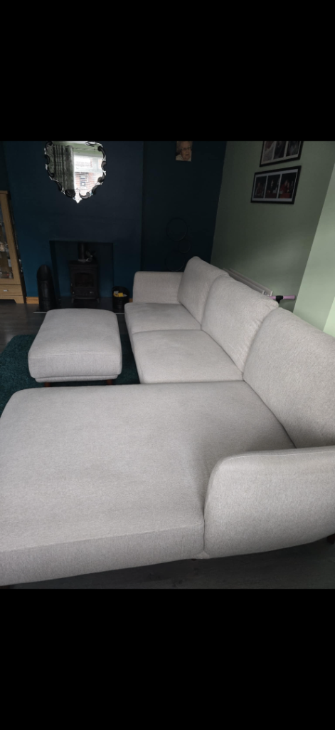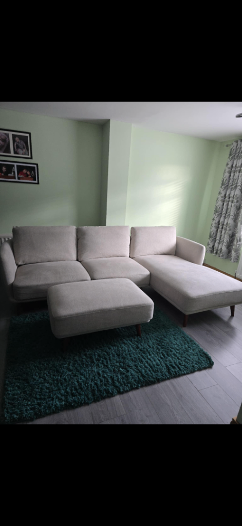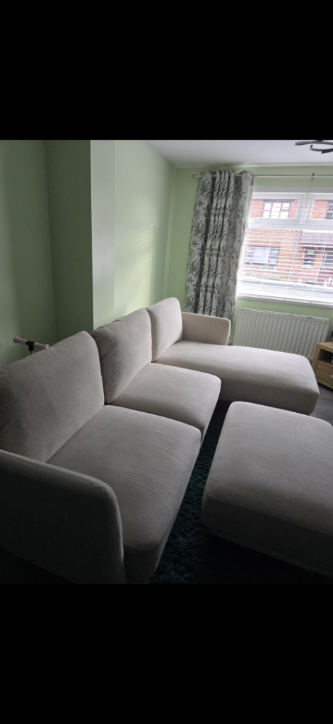 Beige corner sofa for sale. Less than 1 year old, only selling due to colour change. Comes from smoke and pet free home. Excellent condition!! Needs gone asap! Open to reasonable offers!