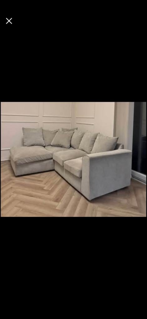 Corner sofa,some cushions are reversible to the check grey. One of the zips are burst on one of the cushions but doesn’t effect use can’t see when all cushions are on.