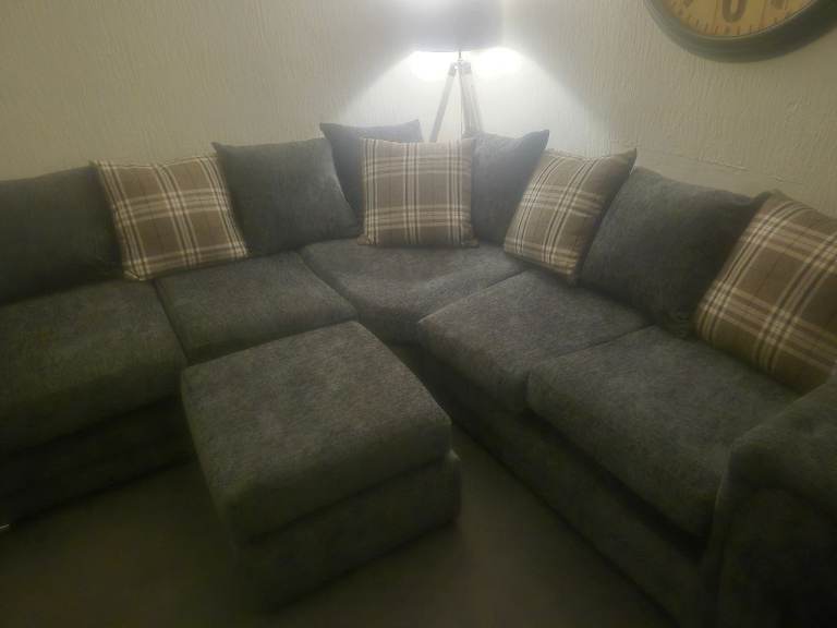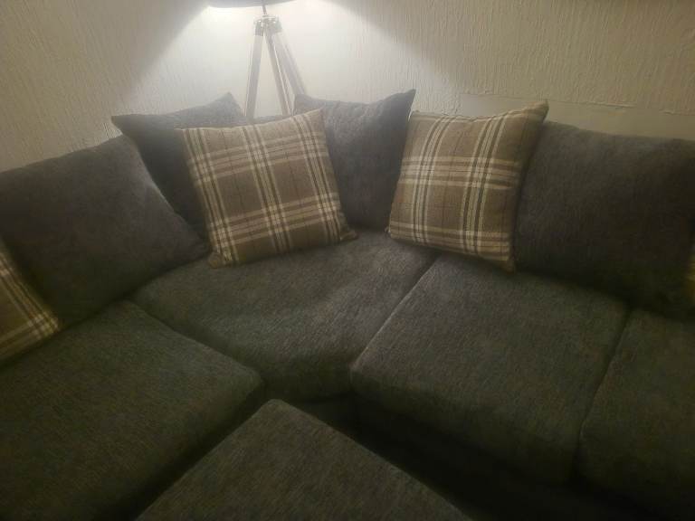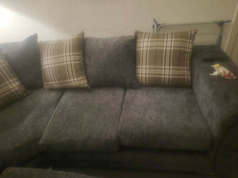 Very large grey corner sofa 3months old too big for my living room very rarely used. Splits into 4 sections for easy moving all cushions included 6 grey 4 checked but grey on otherside