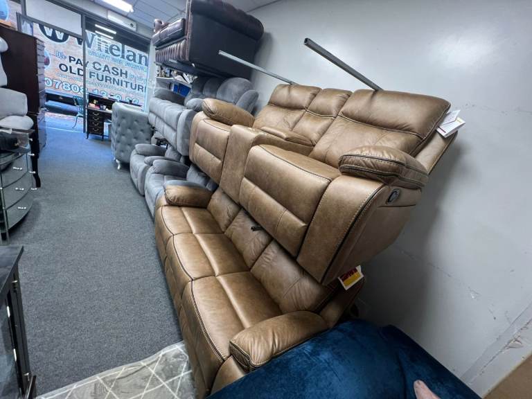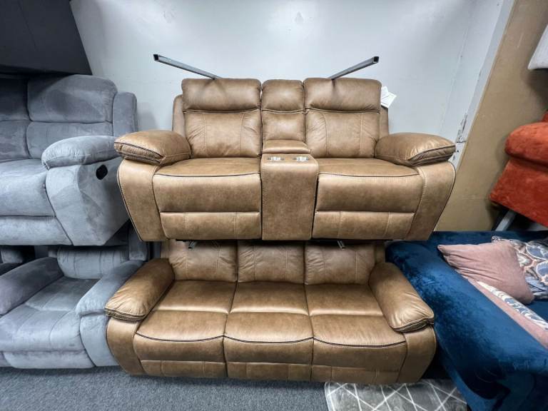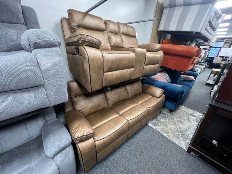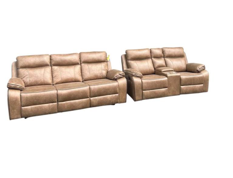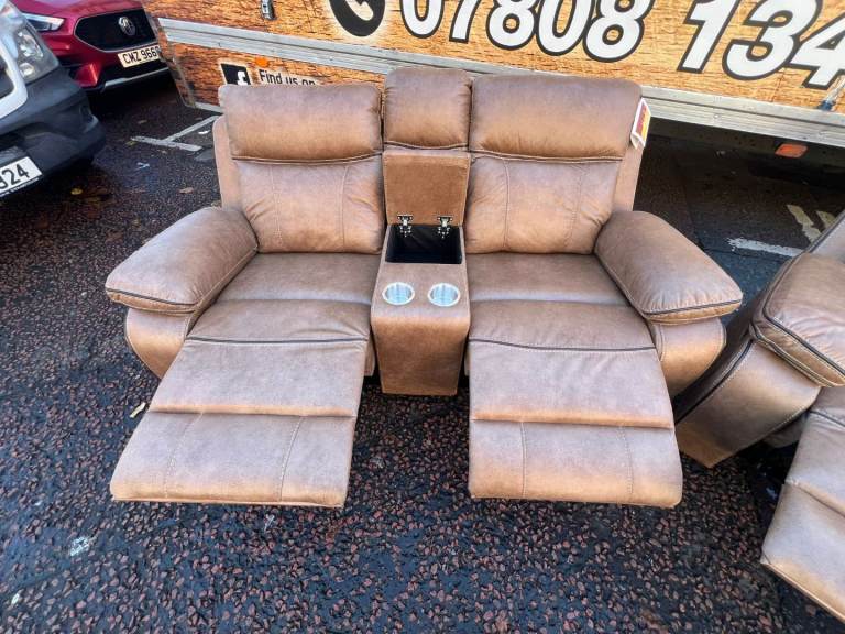 🫸The ALOISE model is a manual recliner model the 3 seater has a drop down drinks tray on the middle section this model is upholstered in the Tan fabric and look great in any environment🫷