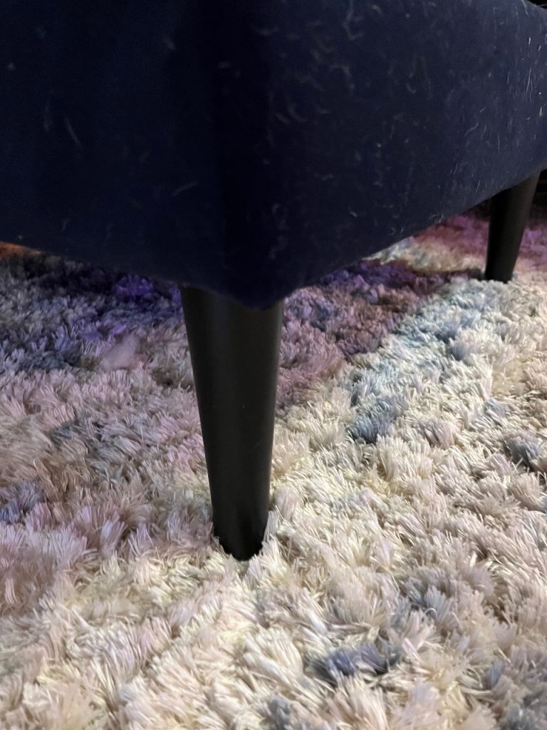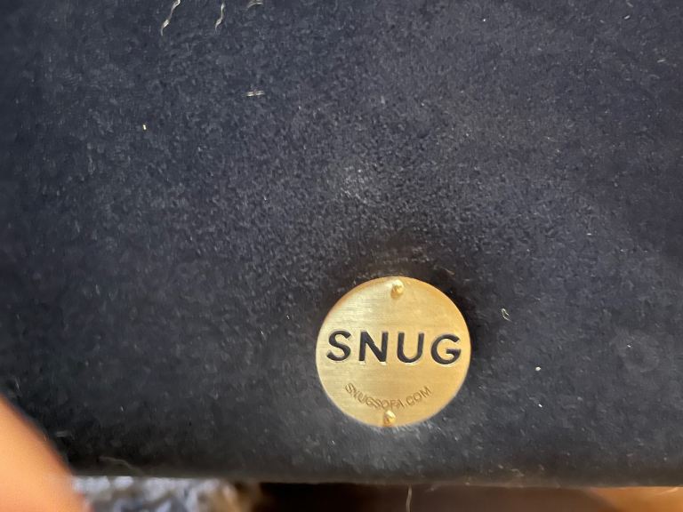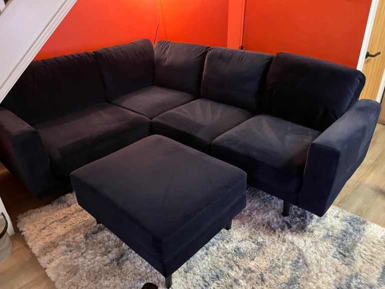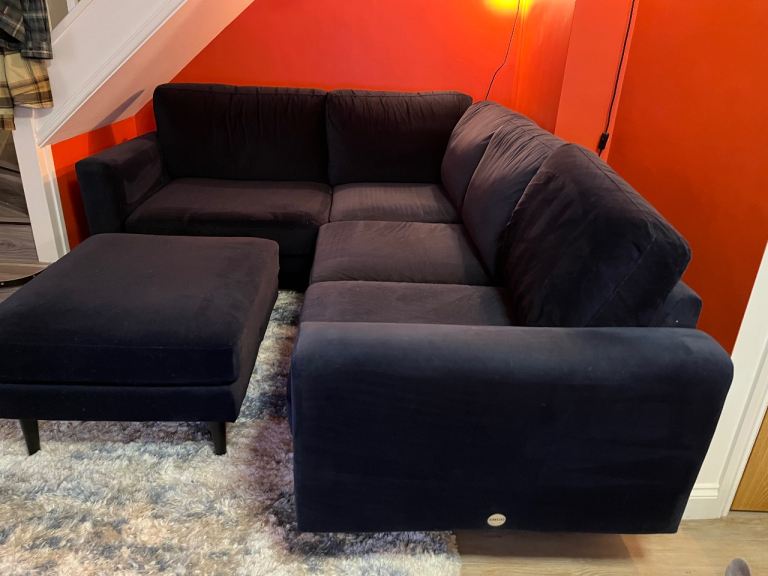 Corner sofa and footstool from Snug in navy velvet. From a home with dogs so does have some pet hair. Other than that it is in great condition, no damage. It’s only a couple of years old. Comes with 2 matching cushions.