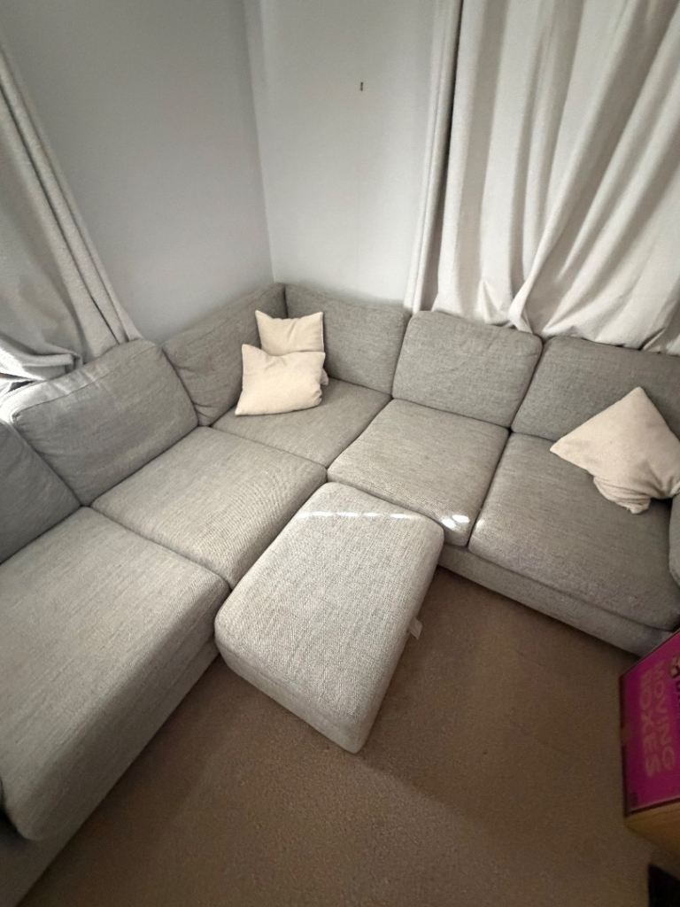 Selling due to moving. Sofa is 3 years old and has been professionally cleaned about 2 months ago. Selling cheap as some damage to corners. Comfortable modular sofa. Footstool has storage inside.