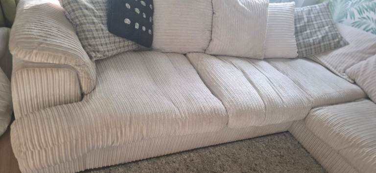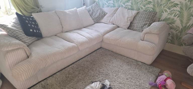 Large jumbo corner sofa. May need some buts of cleaning to it in places. Iv had throws on. No tears very comfy