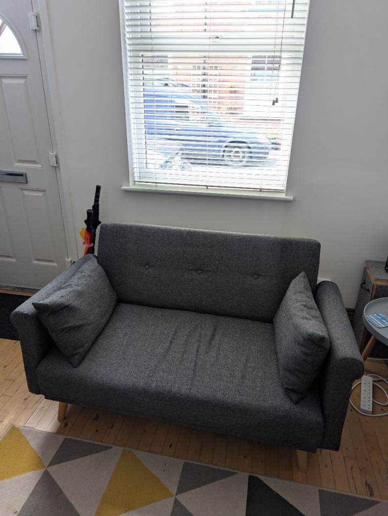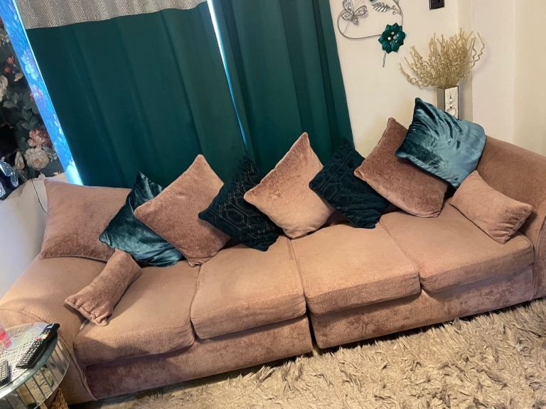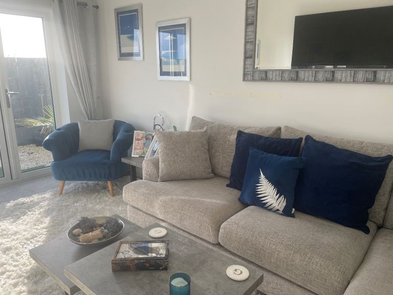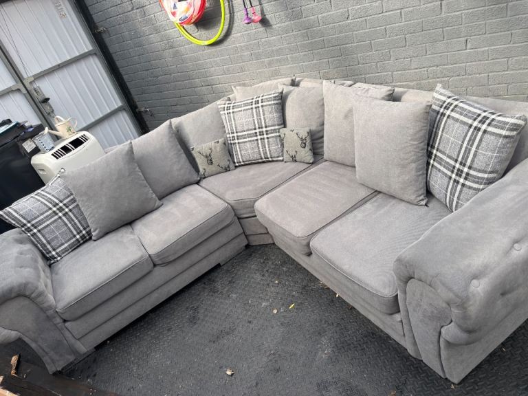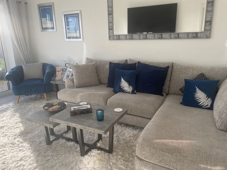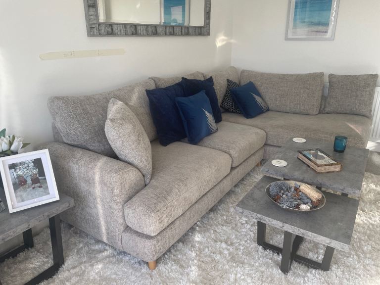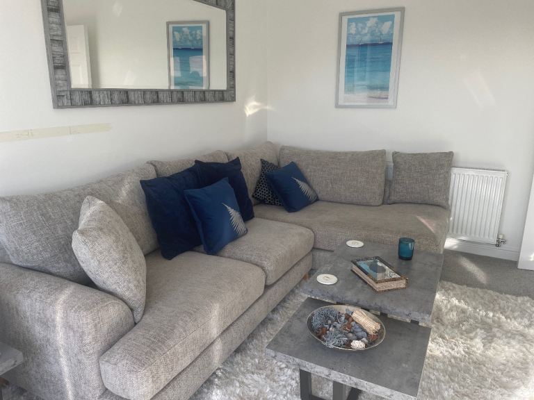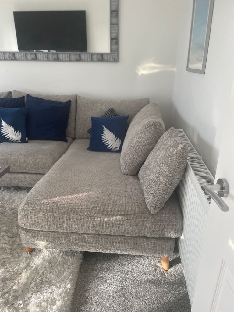 Next Parker Corner Suite in Chunky Chenille, Light Grey and low retro tapered light feet.