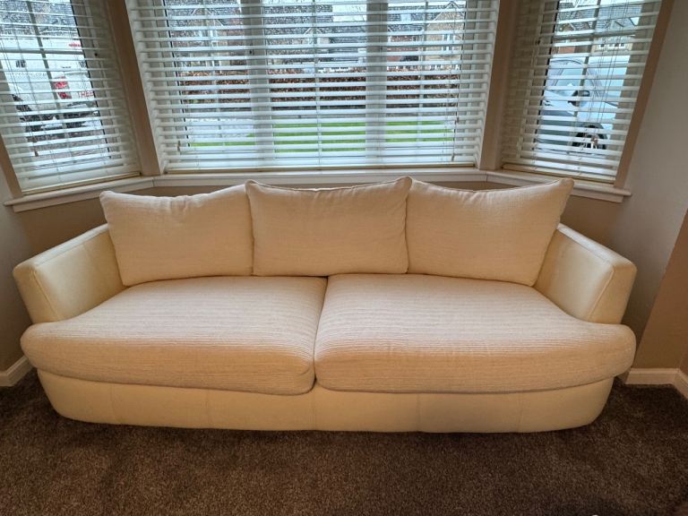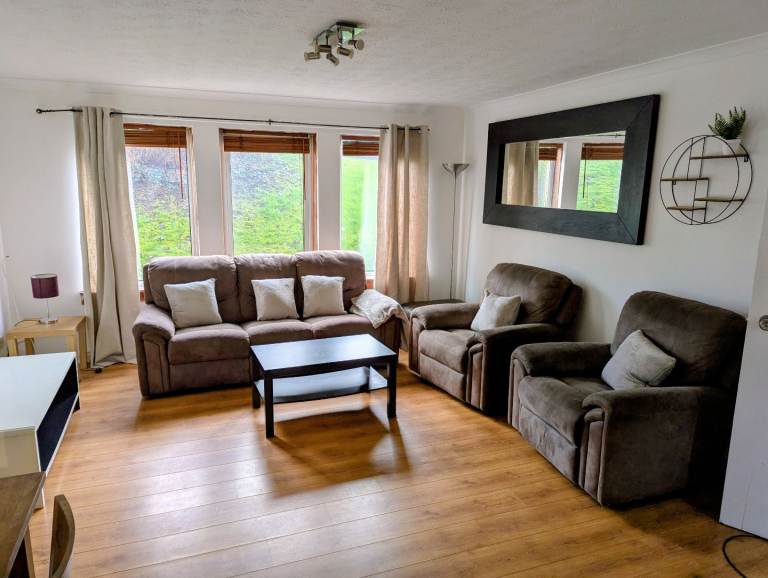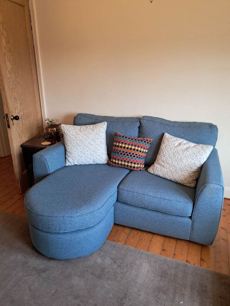 Left handed grey scatter back cushions corner suite. Also large foot stool. Very comfy. From smoke free pet free home. Reduced price for quick sale as new delivery soon.