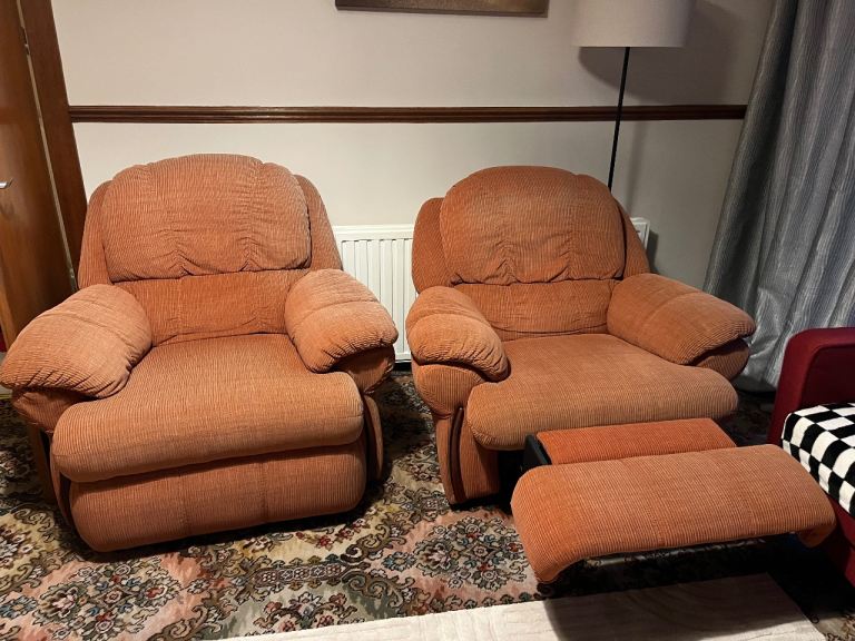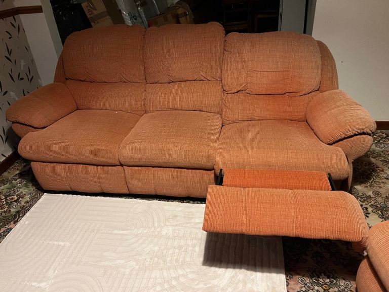 Terracotta 3 seater couch with recliner & 2 arm chairs one reclining comfortable to sit on collection only
