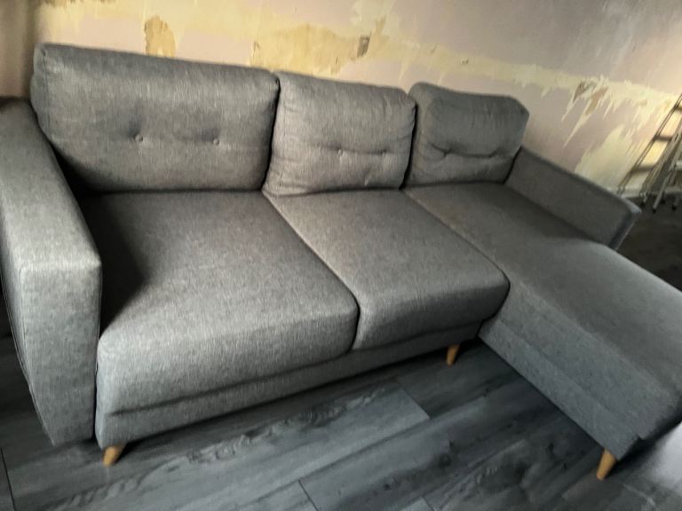 Grey couche turns into a bed and has under storage slight mark due to a juice spill changing my colour scheme