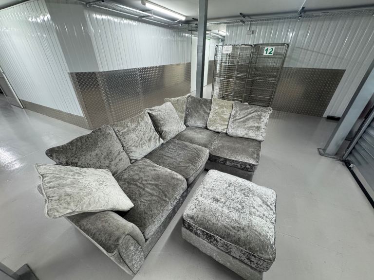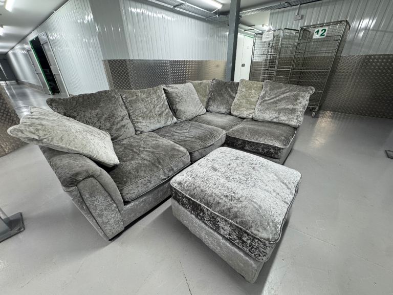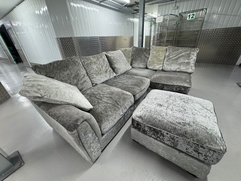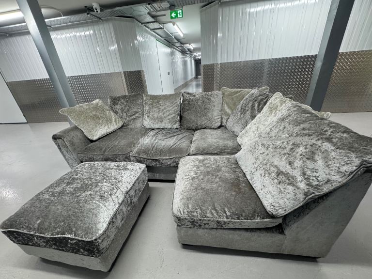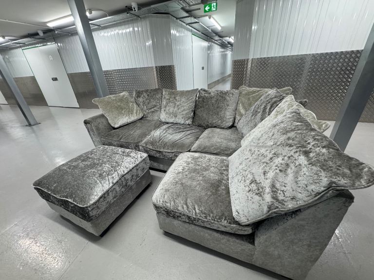 CRUSHED VELVET SILVER CORNER SOFA + FOOTSTOOL - DELIVERY Available