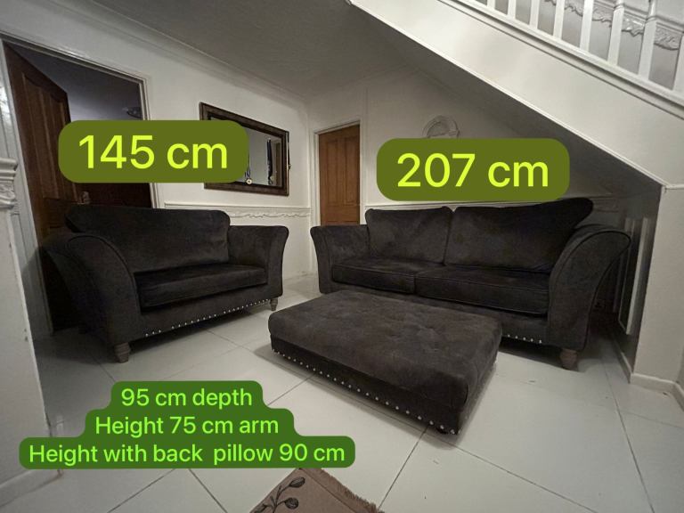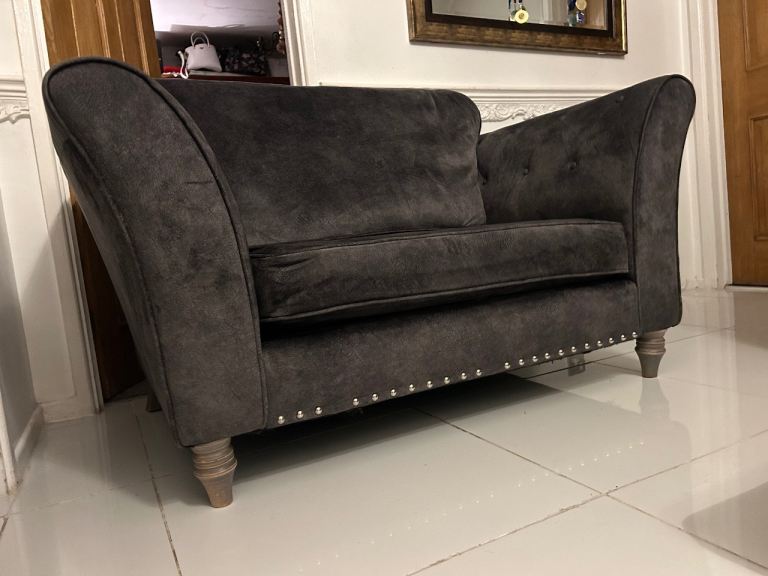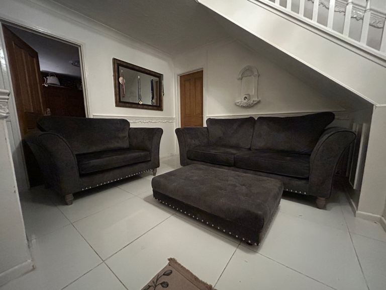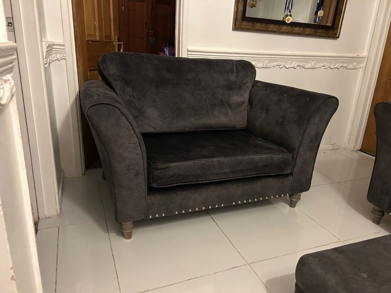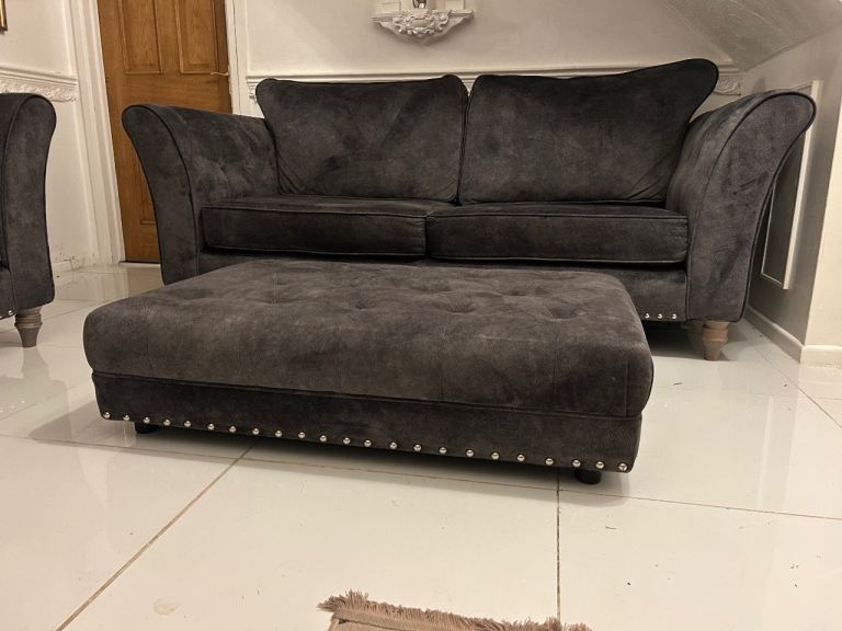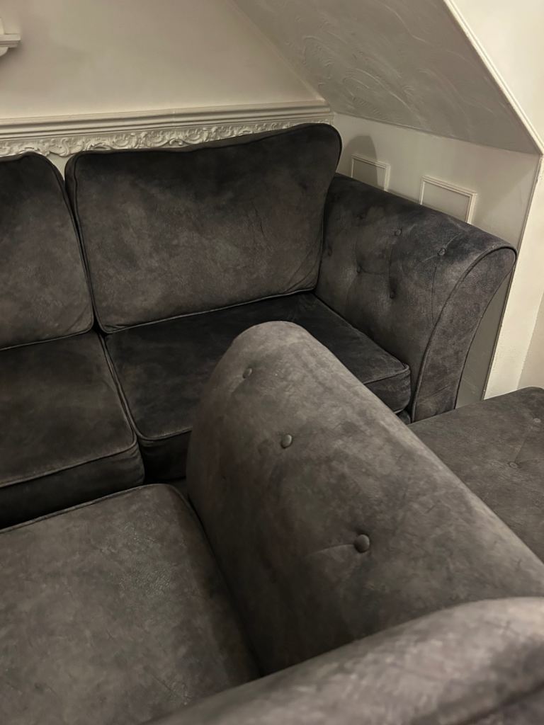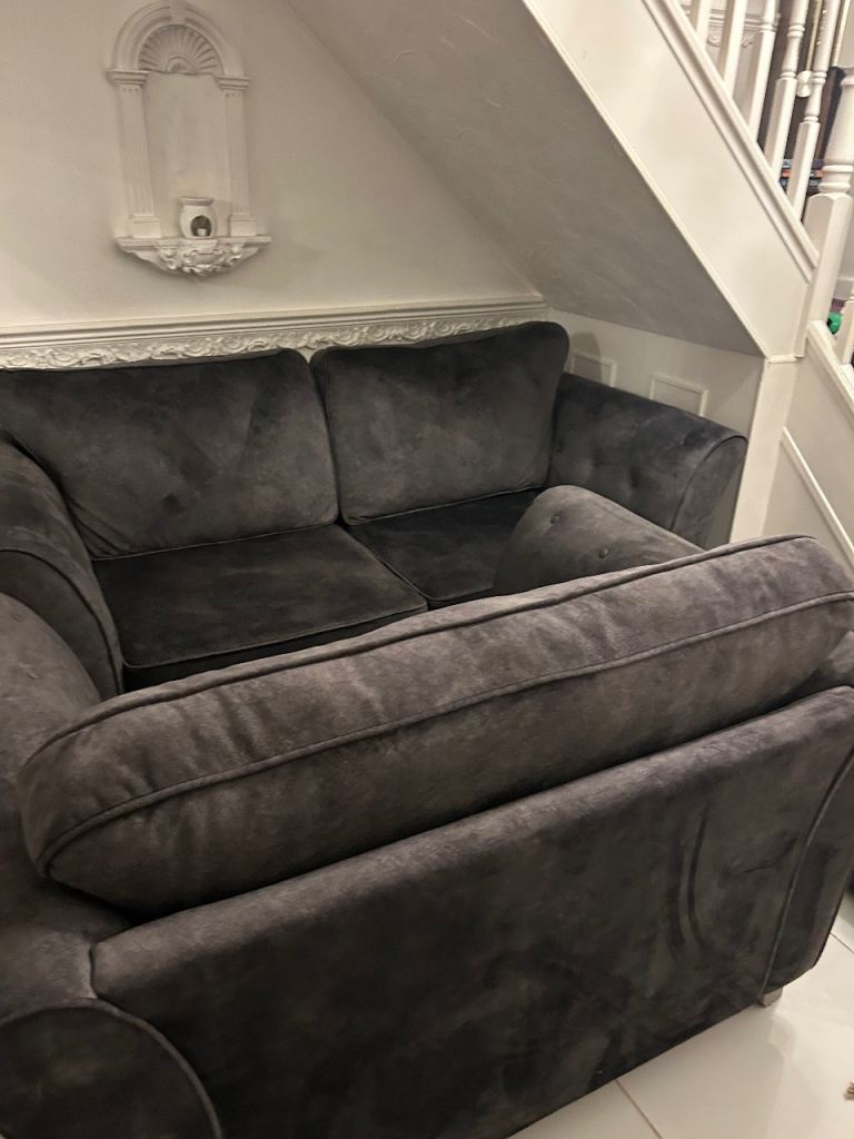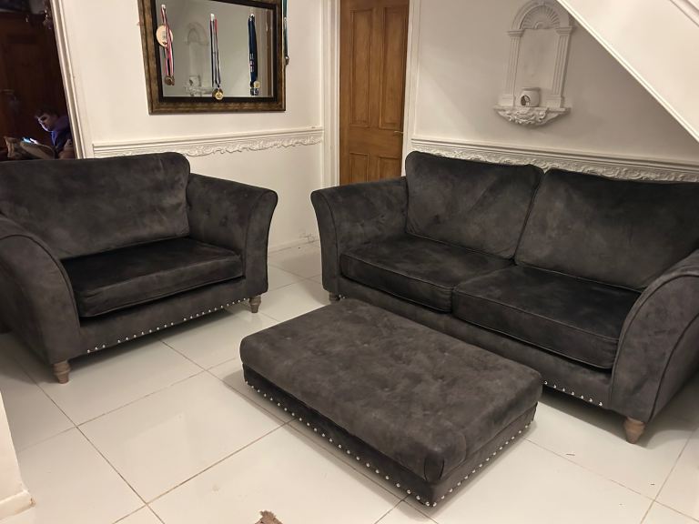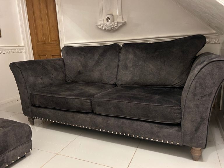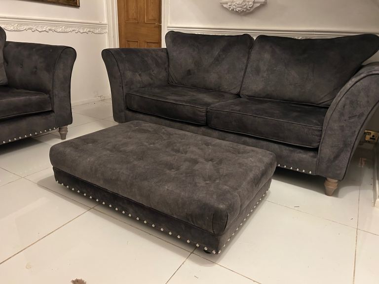 Dark grey velvet 3 seater sofa , cuddle chair & footstool DELIVERY AVAILABLE