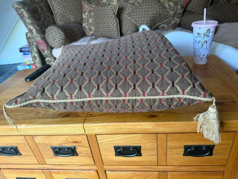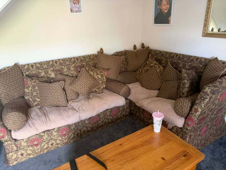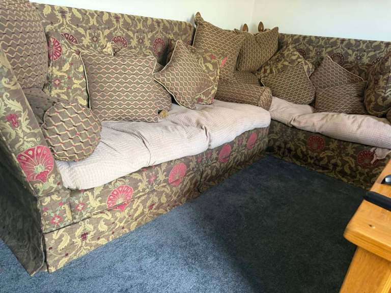 Lovely well used 2 4 seater sofas wanted 1000 for both but open to offers these still sell for atleast £2.500 each second hand no feet and missing a tassle of one of the cushions as pictured i have made this in to a corner couch but have the arm to go back on