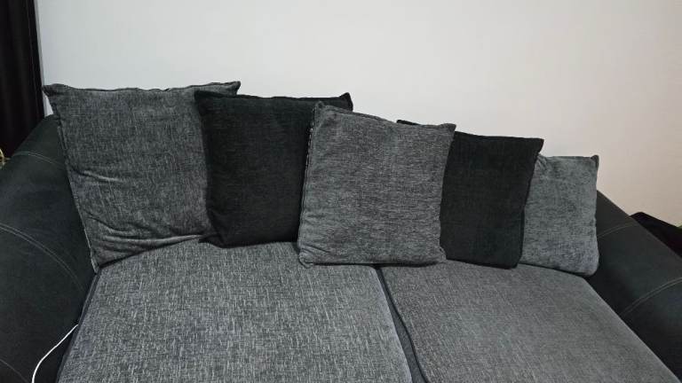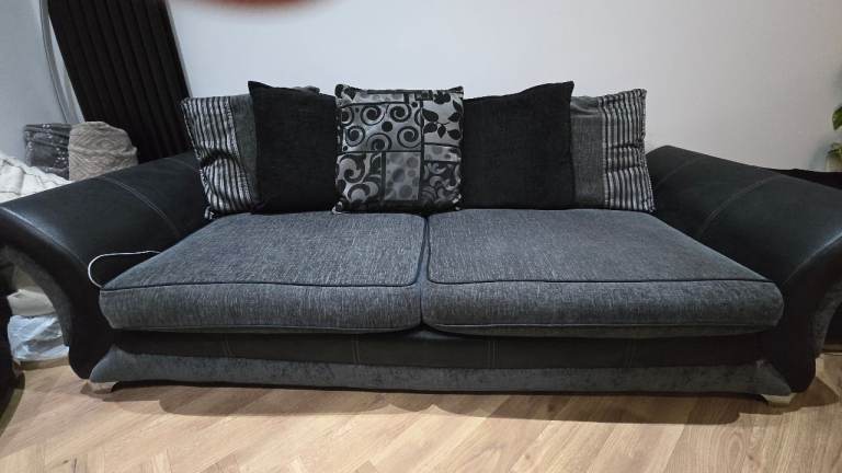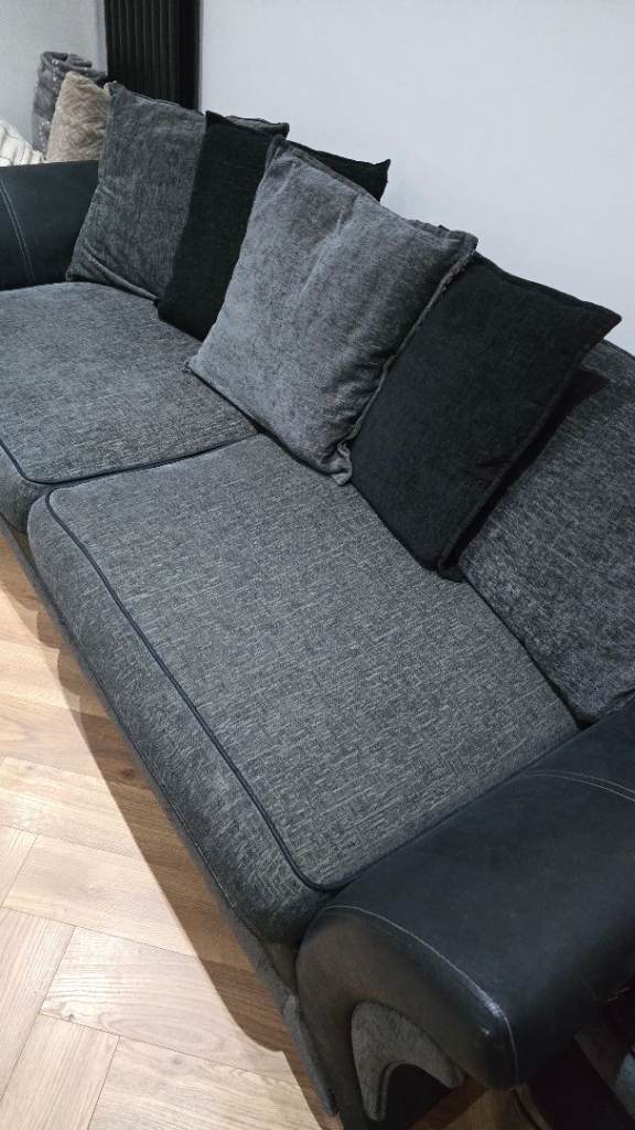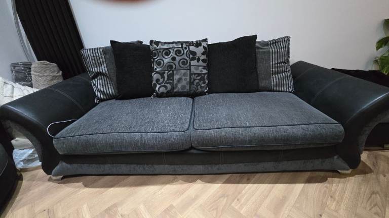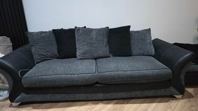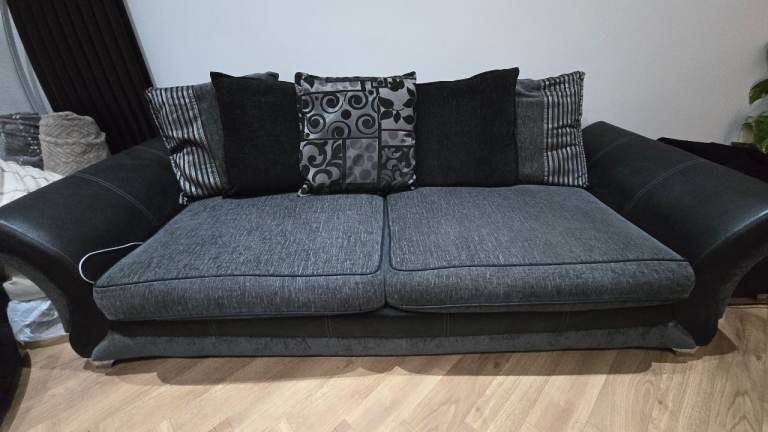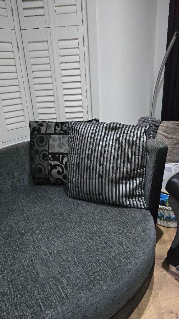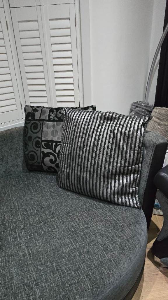 Grey and black with cushion back. In good condition. From a pet free, smoke free and child free household.