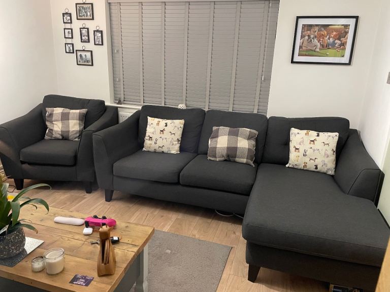 Charcoal sofa and chair, the lounger end can be moved to the other side too.