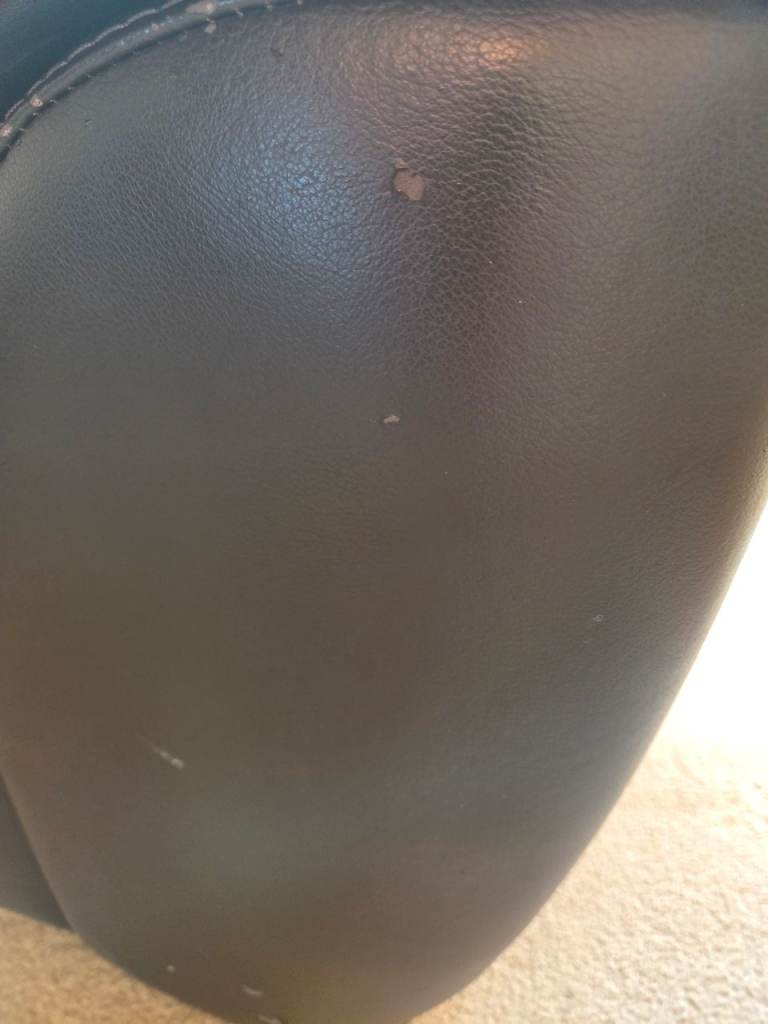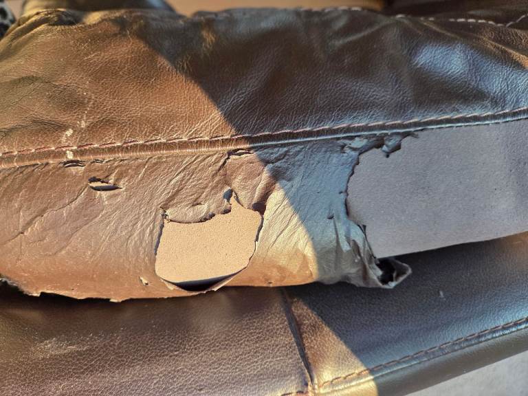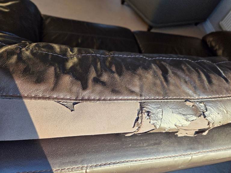 1950mm long x 950mm max. Very comfortable Brown Large 2 seater Leather Sofa. As you can see in the photos Leather is peeling off the back but this cannot be seen from the front of the sofa. Cushions are in very good condition. No sagging. Absolute bargain!