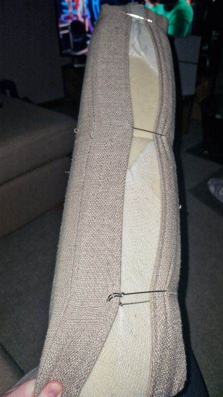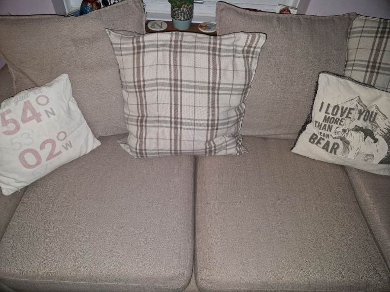 8 years old, there has been a dog in the house therefore some wear and tear as expected therefore fair condition. Seperates into 2 for easier travel. One of the main cushions zip has broken off so held together with pins at present although could be easily fixed. Scatter cushions with sofa. Although x3 small cushions also in photo not included. Arms of sofa will benefit from slight clean.