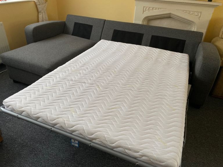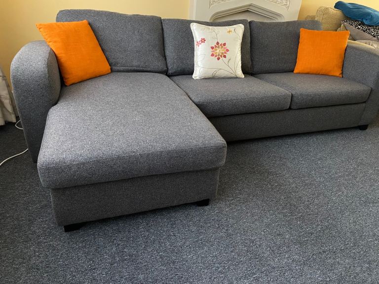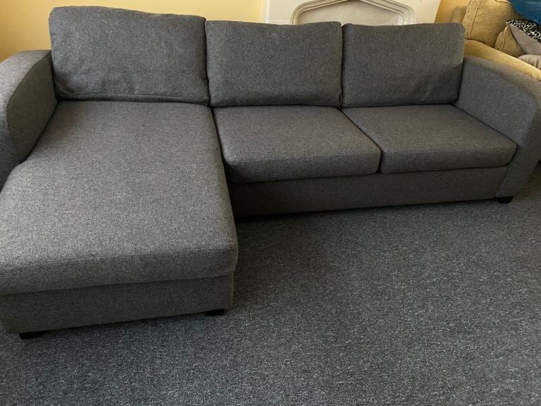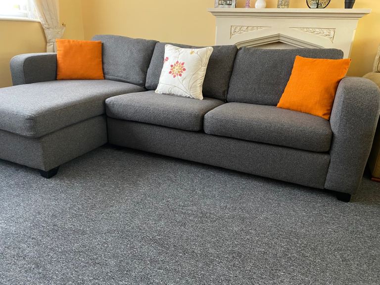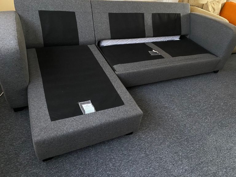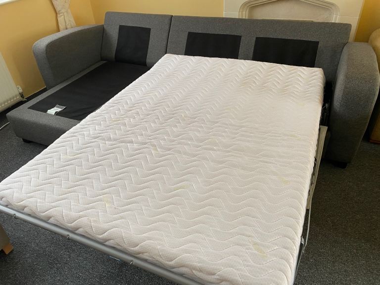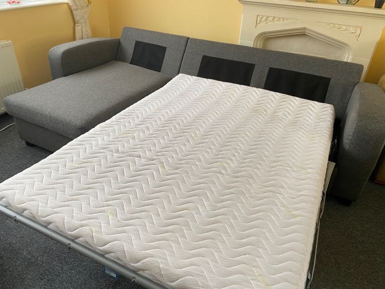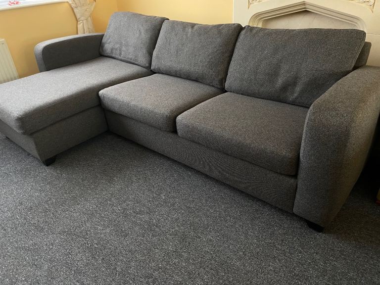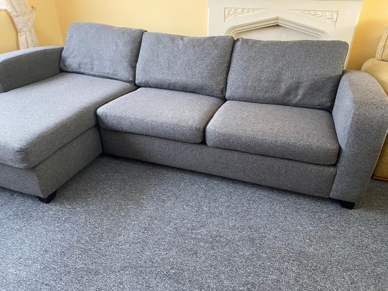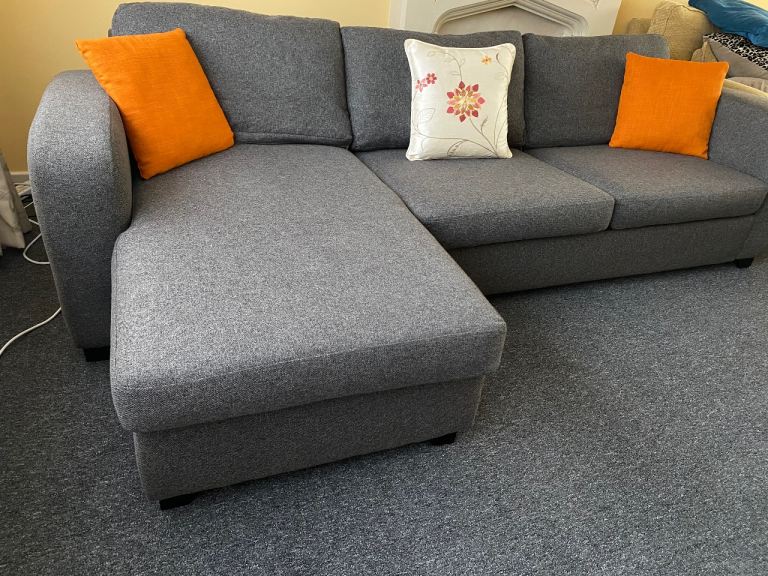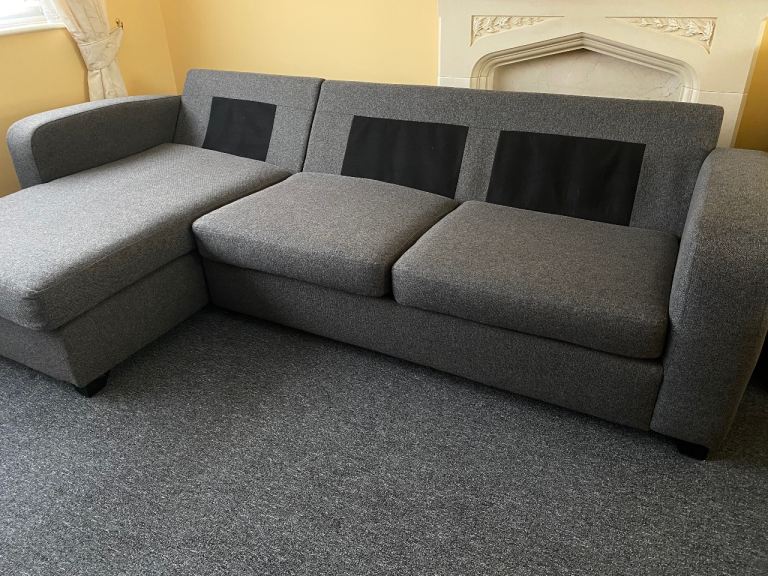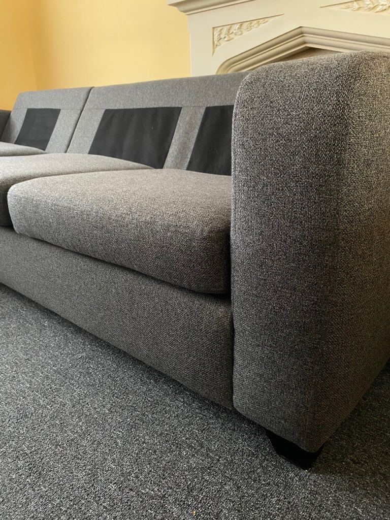 DFS Corner sofa bed, dark gray, excellent condition, thoroughly cleaned and covers freshly washed, smoke-free and pet-free home, measures 270 cm by 150 cm, H-72 cm, and the bed mattress is 135/185 cm, separates into two parts, can deliver for an extra cost (small pillows are not included).