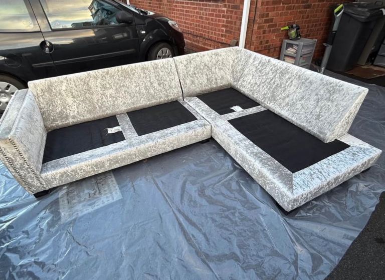 5 years old. Good condition. Crushed velvet corner sofa, colours truffle and ice. Collect from Kidderminster