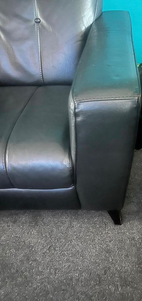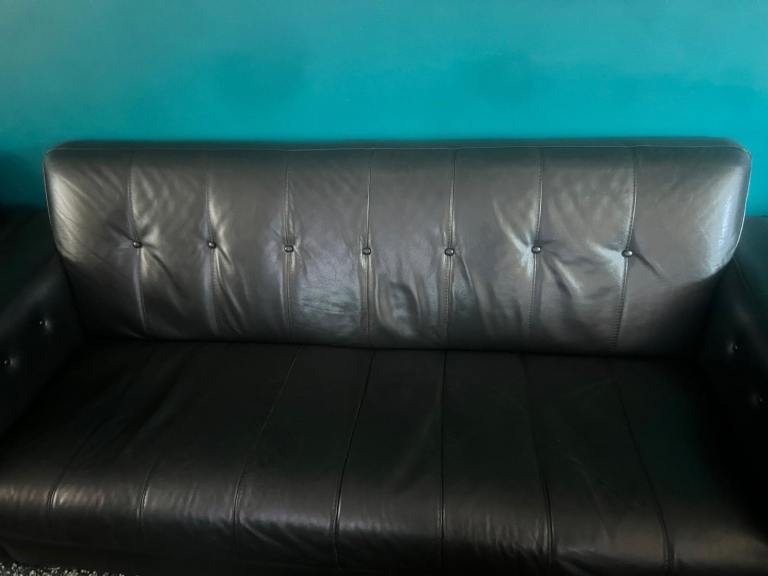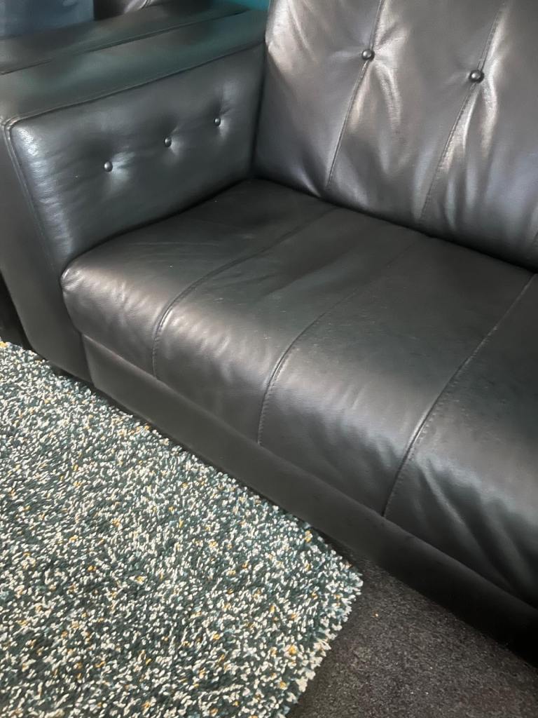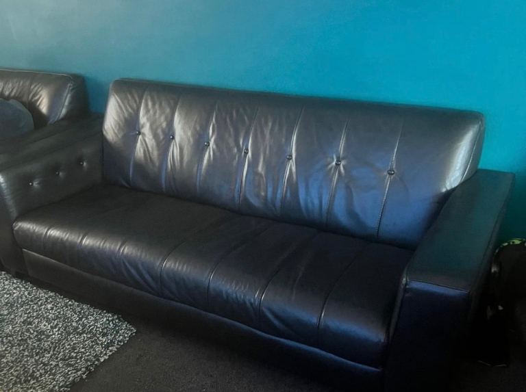 Two DFS leather sofas in good condition with some age-related marks from normal use.