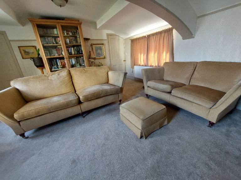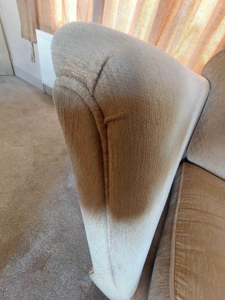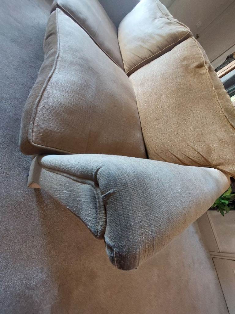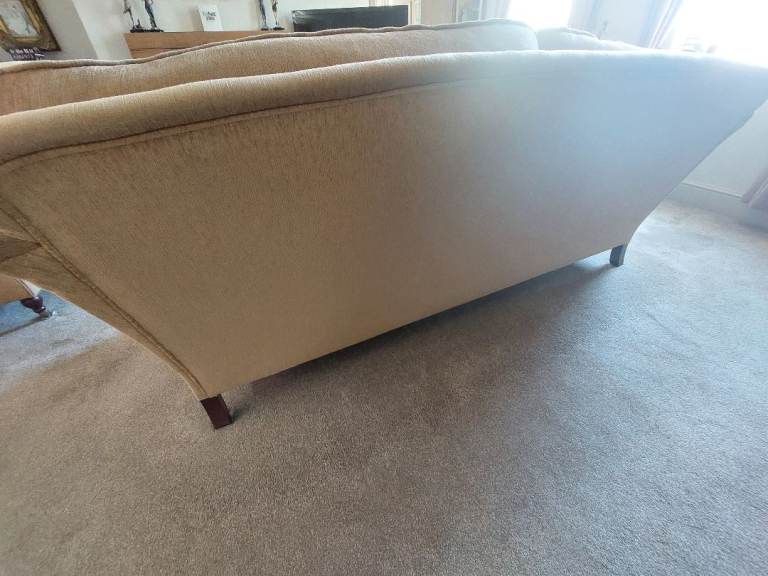 Duresta Gold Chenille Seater Sofa Narrow Arms. 1 arm is dirty/worn on front edge as shown. Fair on arms.