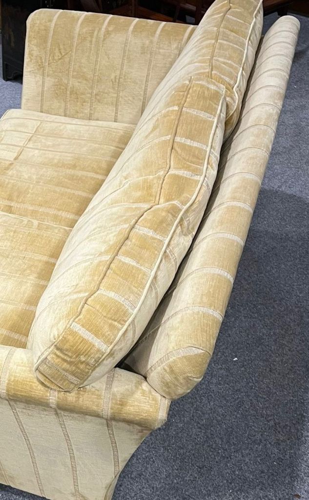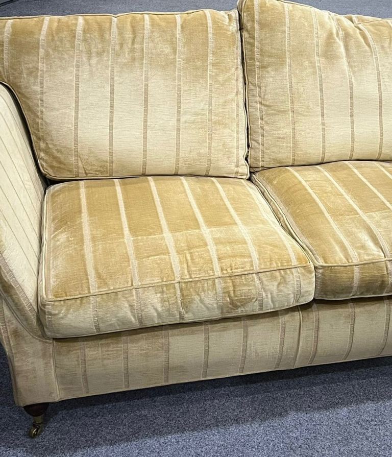 a two-seat sofa of generous proportions with deep padded back and seats, scrolling arms and loose cushions, upholstered throughout in a gold-toned striped velvet, raised on turned mahogany legs with brass castors Sofa 177cm long