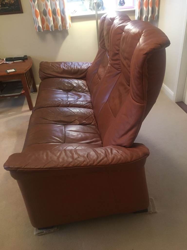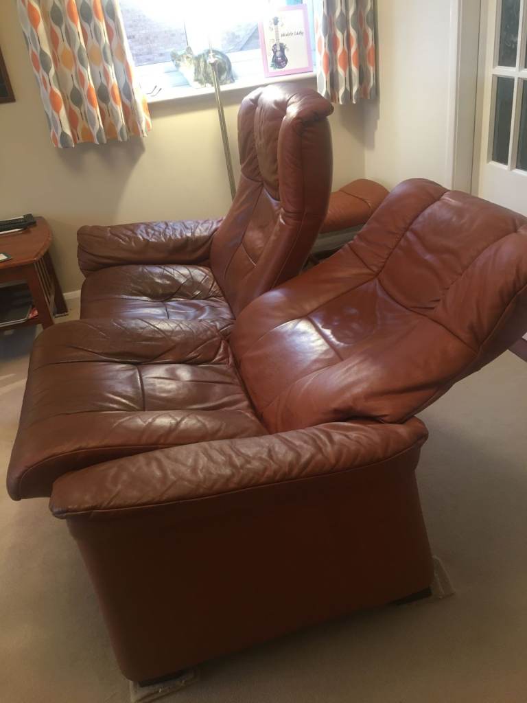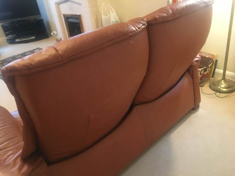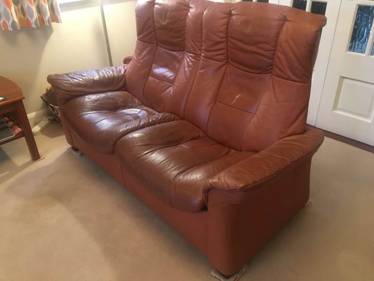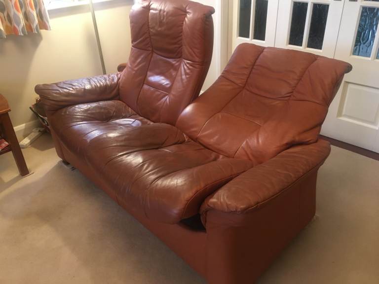 2 seater sofa by Stressless. Fully functional and comfortable. One seat cushion saggy and general wear to leather, Paloma leather in Brandy shade. Quiet heavy so needs 2 persons to carry.