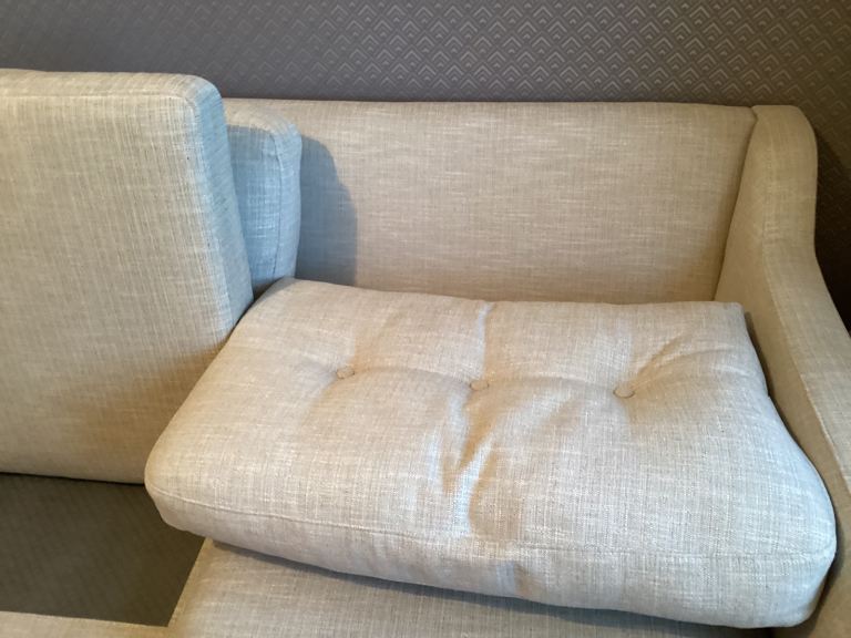 Ercol as new large sofa in beige linen weave neutral fabric . Pale oak modern feet / legs . In excellent condition and from smoke free and child free home . Planned move necessitates sale of this item . There is a smaller shorter sofa available too in the same fabric making a pair of required . This Posted separately . Additionally there is an Ercol footstool in teaming same fabric different colour . Mushroom grey brown . Will post dimensions .