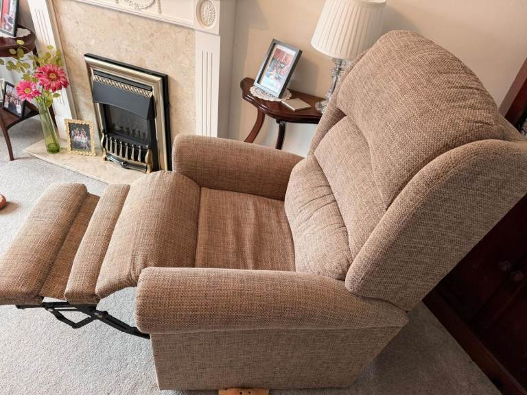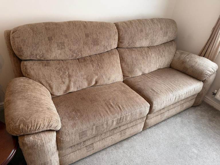Selling a matching fabric 3-seater sofa and 2 recliner armchairs in a neutral beige/taupe colour that suits most living rooms. All pieces are well-made, supportive, and very comfortable.