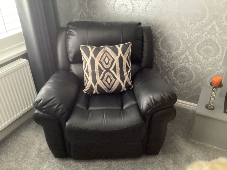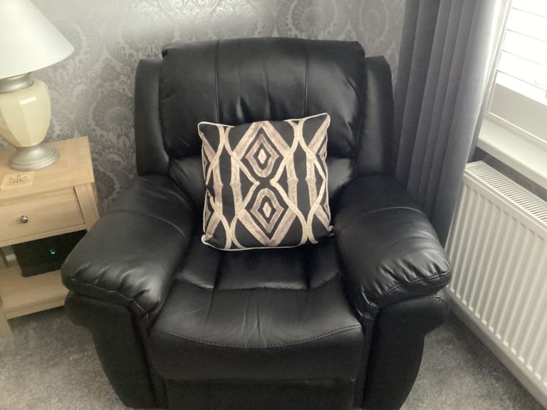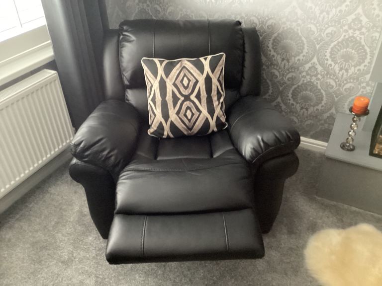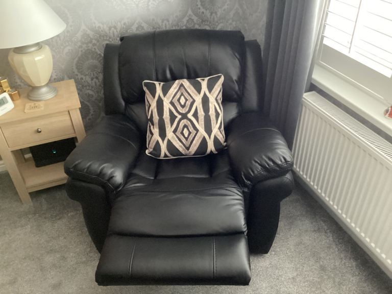 Farnham three piece (3+1+1) Black coloured Leather Air Fabric suite. Both the armchairs and the settee, offer a 2-stage recliner action, allowing for a fully reclined position.